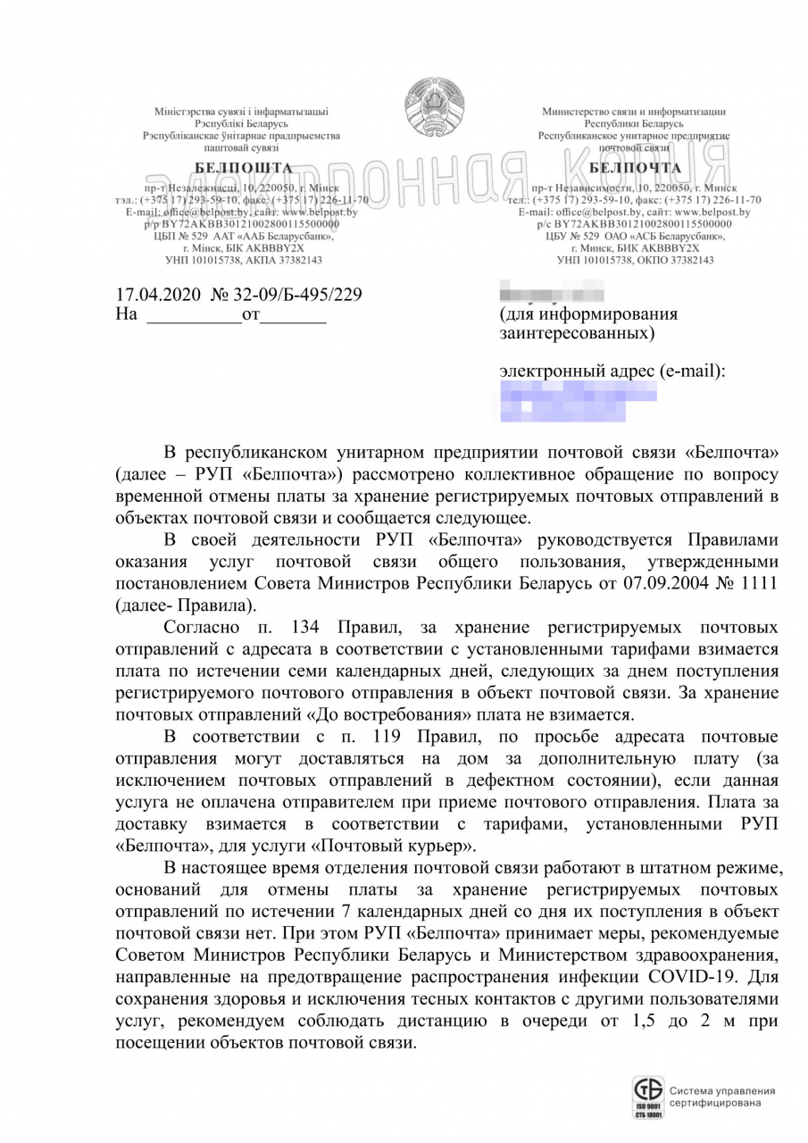 На данный момент в почтовых отделениях действует п. 134 Правил оказания почтовых услуг: за хранение регистрируемых почтовых отправлений с адресата в соответствии с установленными тарифами взимается плата по истечении семи календарных дней, следующих за днем поступления регистрируемого почтового отправления в объект почтовой связи. (п. 134 в ред. постановления Совмина от 14.01.2020 N 16)