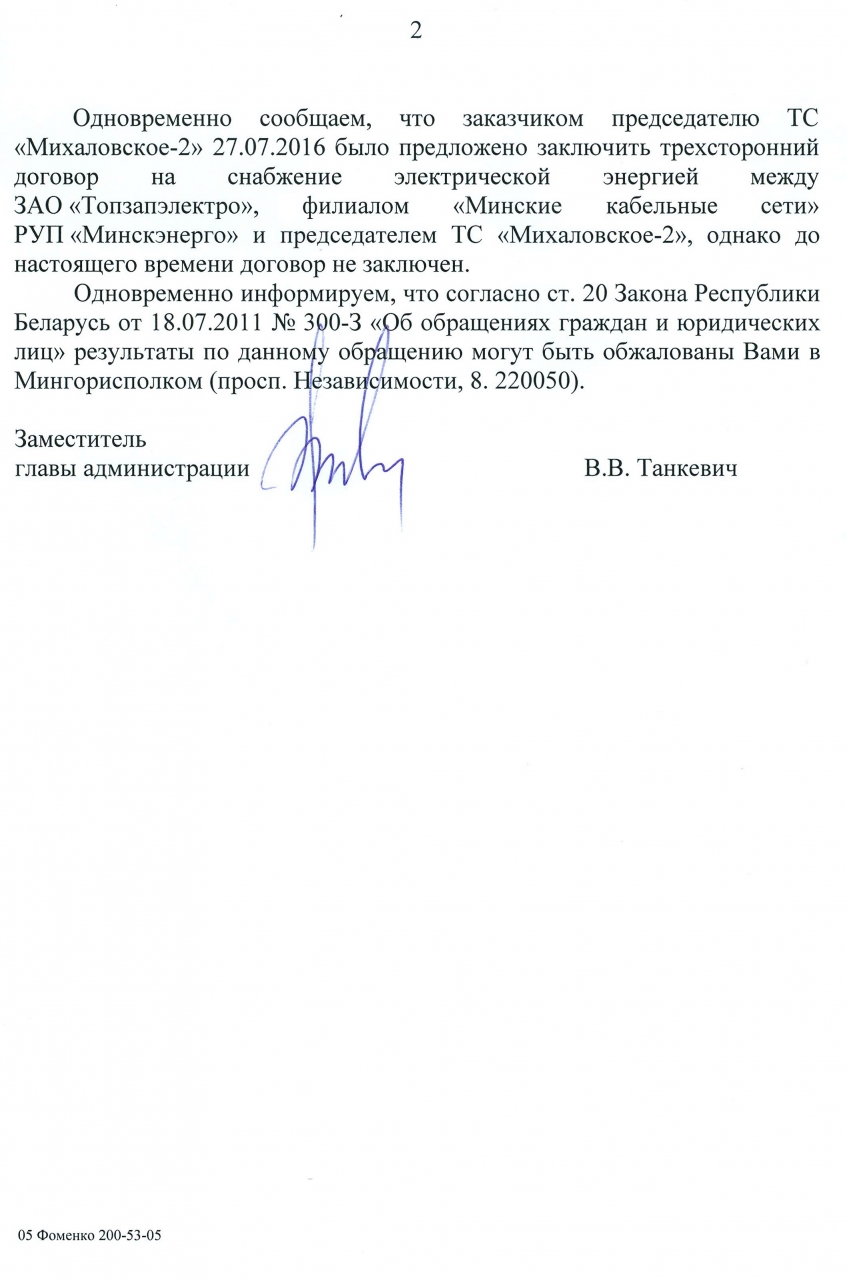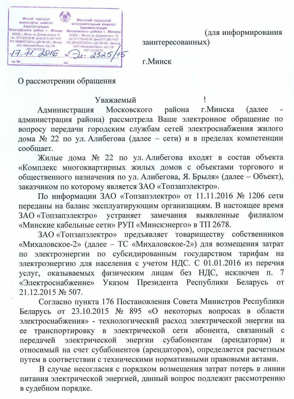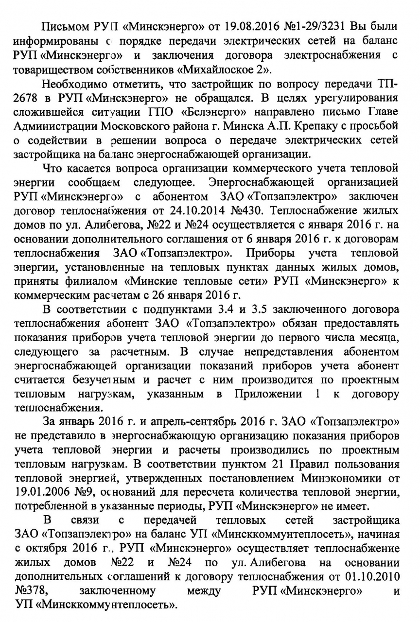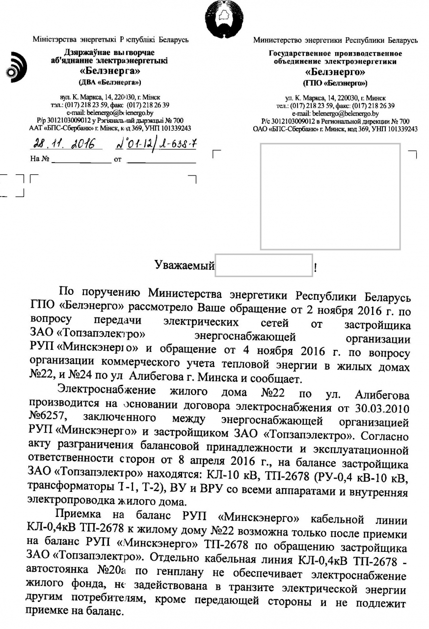 Застройщик ЗАО "Топзапэлектро" обещал жителям дома 22 по ул. Алибегова в г. Минске, что они в октябре 2016 г. передадут электросети городским службам и у жителей дома появится возможность оплачивать потреблённую ими электроэнергию по приборам учёта.
