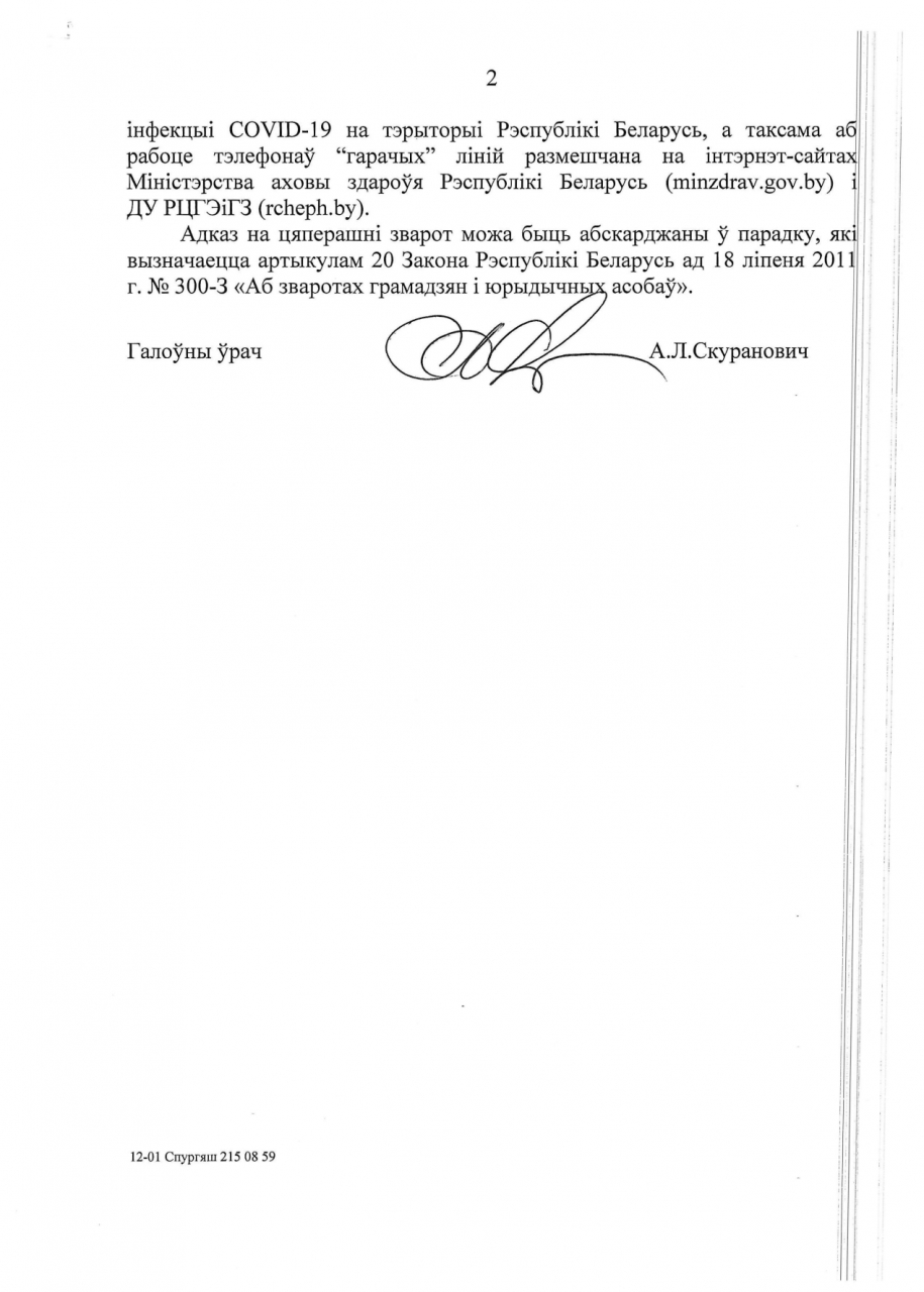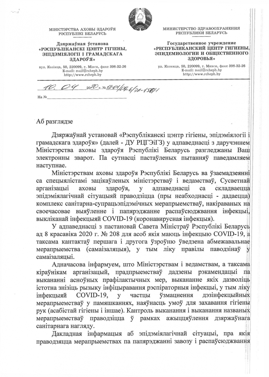 В связи с существующей эпидемиологический ситуацией в мире и в Республике Беларусь, учитывая рост числа пациентов и лиц, контактировавших с ними, и уменьшения свободных мест в больницах для пациентов и лиц, помещённых под наблюдение, просим переоборудовать ледовые дворцы в Республике Беларусь для возможности размещения в них лиц в карантине (не пациентов, а подозреваемых).