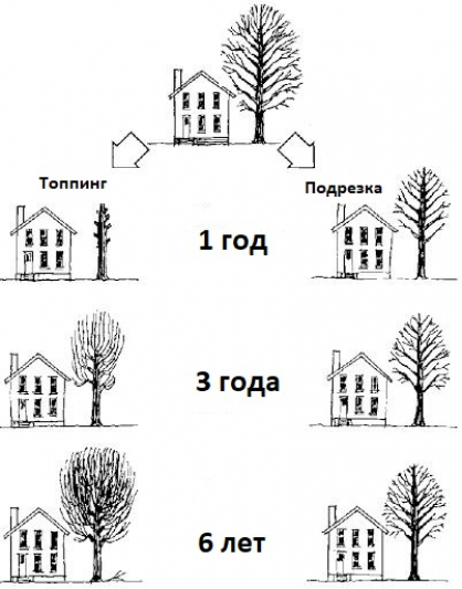Достоверно известно, что деревья, обрезанные таким образом, начинают активно пускать молодую поросль, пытаясь восстановить свой объём. Но новые ветки держатся значительно хуже, что увеличивает шансы их падения в будущем. Также бурный рост вскоре делает необходимым очередную обрезку, когда при прореживании кроны (не более 20% объёма) такого не происходит. Таким образом массовая обрезка повлечёт дополнительные расходы, связанные со скорой необходимостью обрезки вновь.