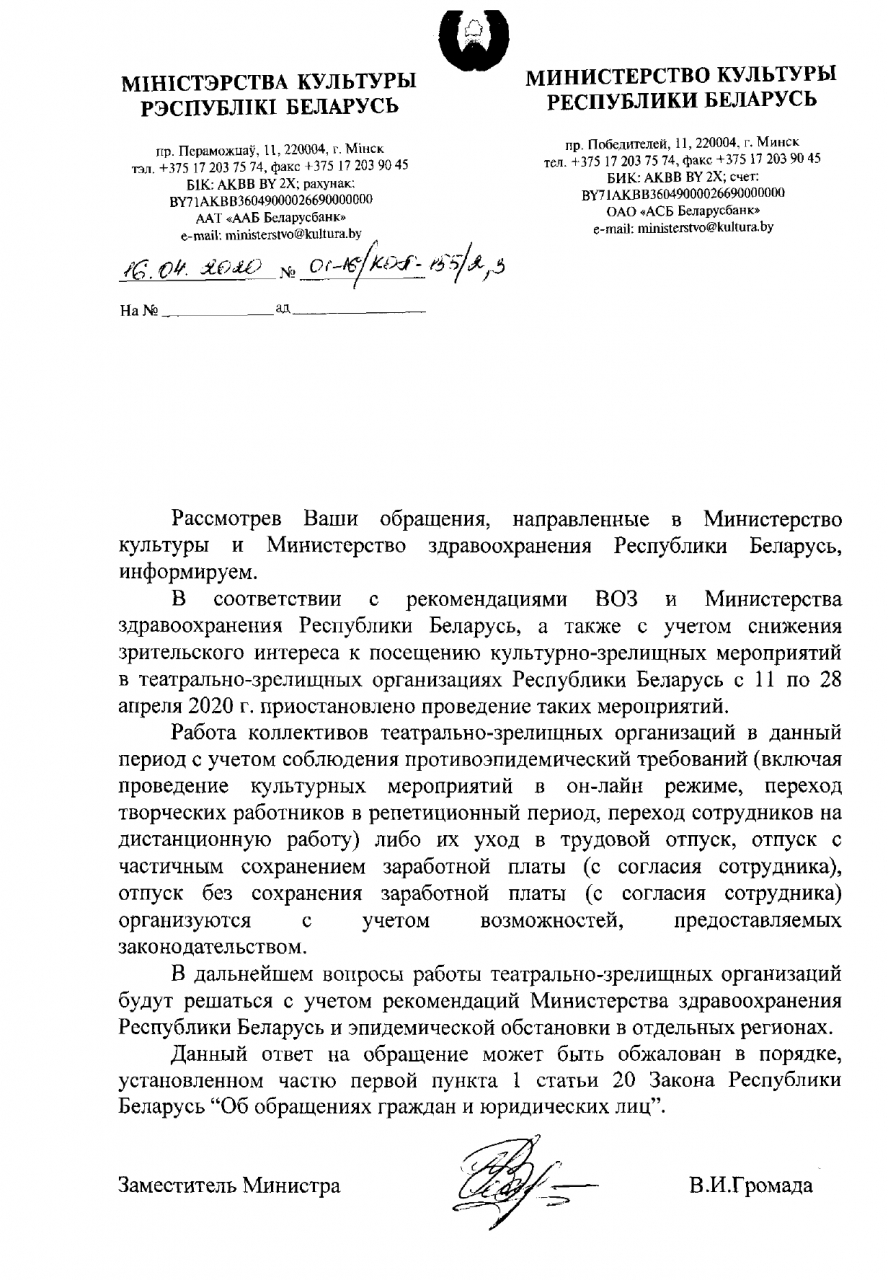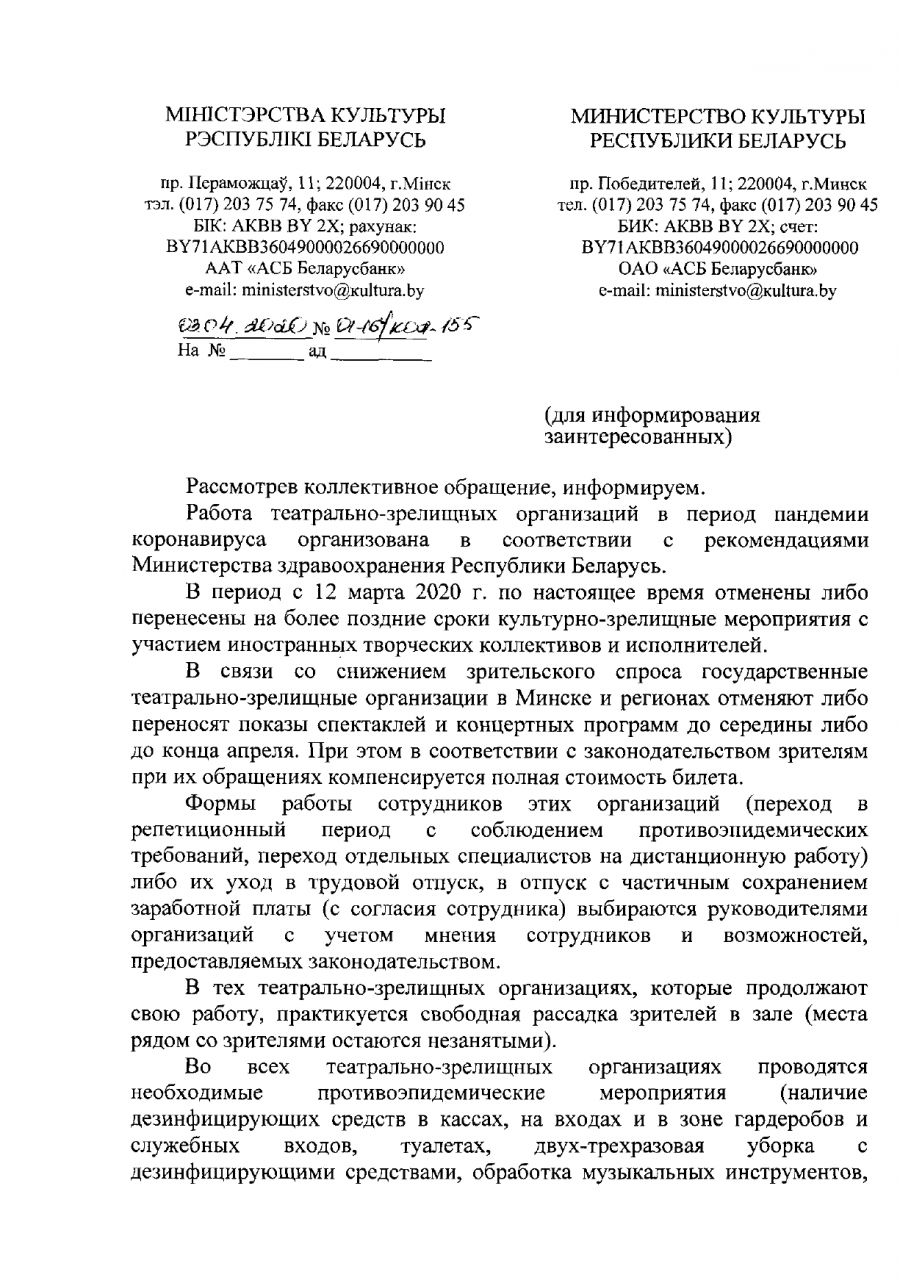 В соответствии с рекомендациями ВОЗ и Минздрава, а также с учётом снижения зрительского интереса к посещению культурно-зрелищных мероприятий в театрально-зрелищных организация с 11 по 28 апреля 2020 г. приостановлено проведение таких мероприятий. В дальнейшем вопросы работы театрально-зрелищных организаций будут решать с учётом рекомендаций Минздрава и эпидемической обстановки в отдельных регионах.