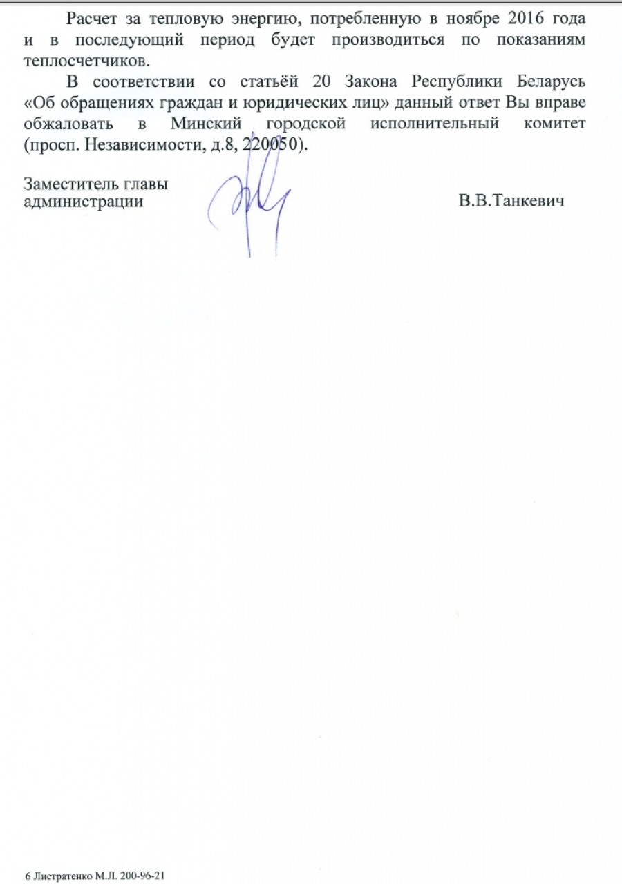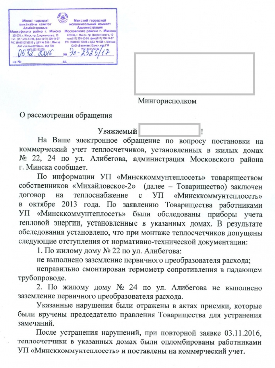 Дома 22 и 24 по ул Алибегова в городе Минске (застройщик ЗАО "Топзапэлектро") приняты в эксплуатацию в марте 2016 года. Несмотря на приёмку теплоузлов в эксплуатацию различными комиссиями, на 01.11.2016 года товарищество собственников не может оформить акты приёмки теплоузлов на коммерческий учёт. В этой связи просим проверить компетентность лиц, принимавших теплоузлы у застройщика ЗАО "Топзапэлектро" со стороны подчиненных министерству энергетики организаций, а также взыскать стоимость отопления за отопительный период с марта 2016 года и за октябрь и ноябрь 2016 вышеуказанных домов за счёт виновных лиц, формально принявших теплоузлы, при условии начисления оплаты за отопление по "нагрузке" или выставления штрафных санкций как неучтённый абонент. О принятых мерах просим проинформировать граждан, подписавших данное обращение.