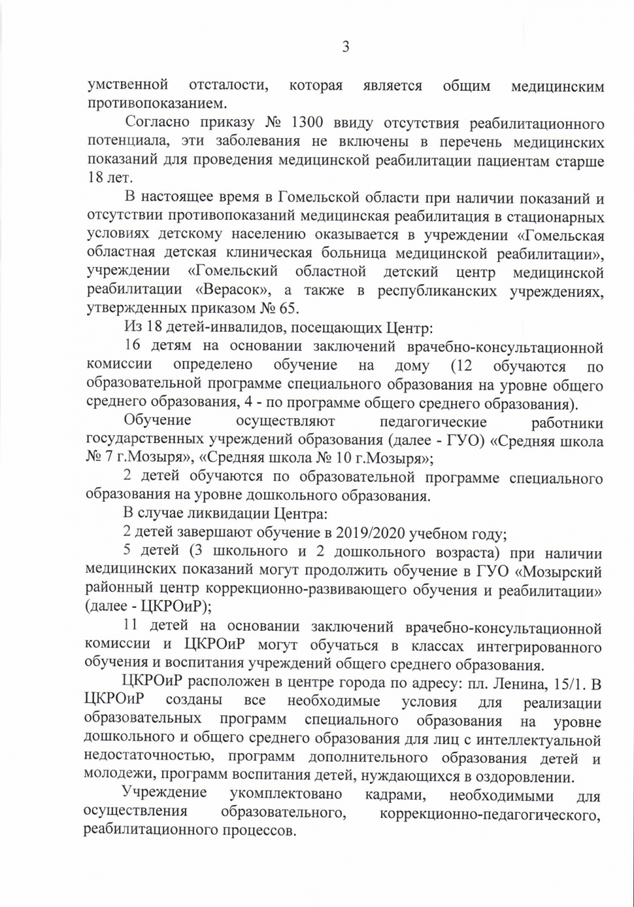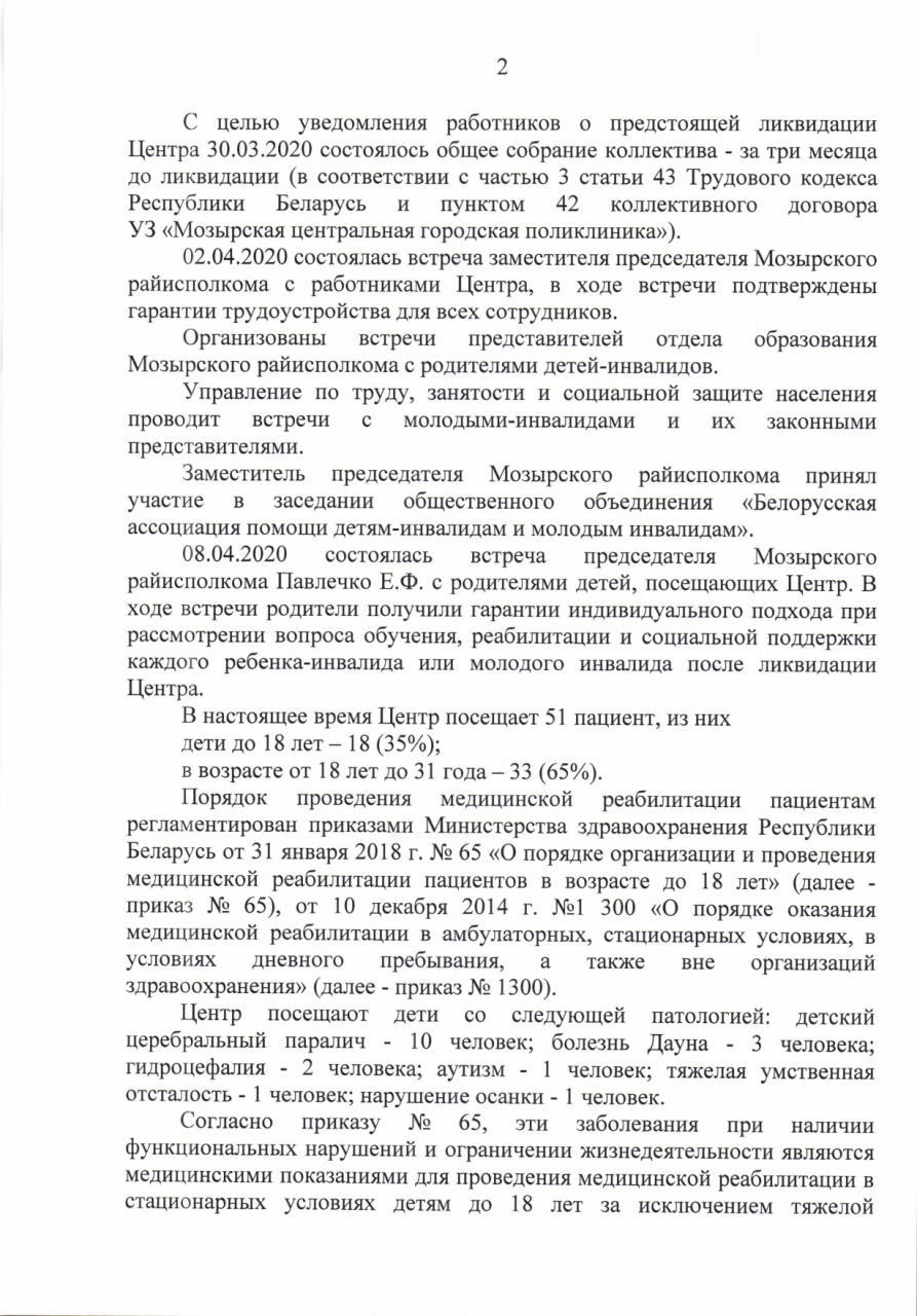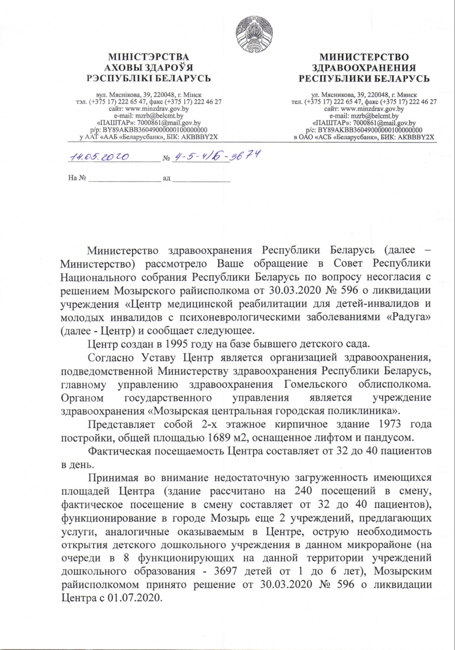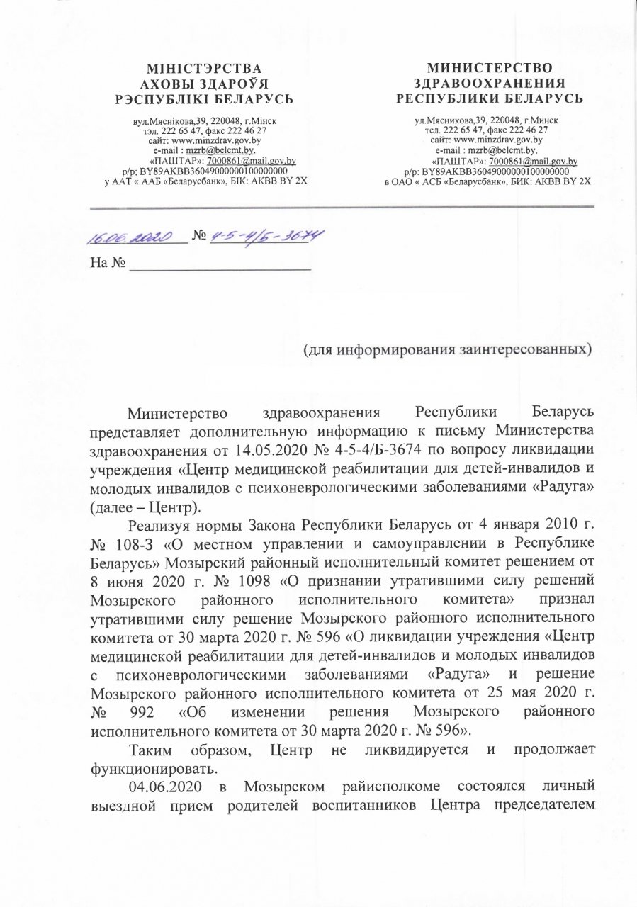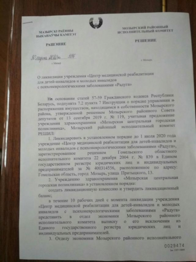 30.03.2020 в г.Мозыре Гомельской обл. местные власти приняли решение о ликвидации Учреждения «Центр медицинской реабилитации детей-инвалидов и молодых инвалидов с психоневрологическими заболеваниями «Радуга». Центр проработал много лет, посещают его более 50 инвалидов разного возраста. Работа в центре построена таким образом, что детки с ограниченными возможностями получают здесь не только так нужное им лечение и процедуры, но и проходят обучение,занимаются с узкими специалистами (дефектологи-логопеды, психологи), общаются, проводят совместные праздники и мероприятия. Для наших деток центр давно стал вторым домом, где их любят и ждут. Центр оборудован лифтом и пандусами, прекрасный коллектив, дружелюбная семейная атмосфера.