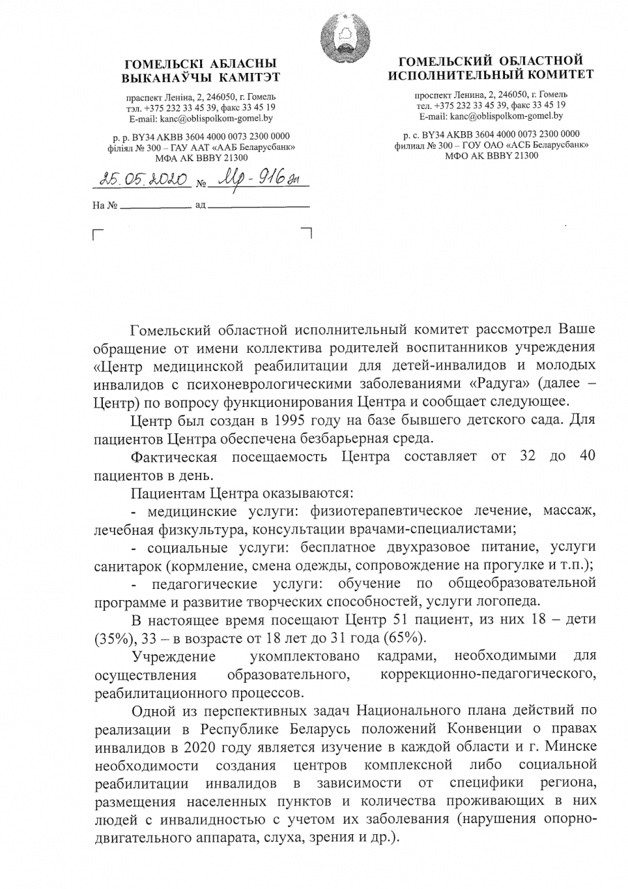 Гомельский облисполком пришёл к выводу о необходимости продолжения функционирования центра медицинской реабилитации детей-инвалидов и молодых инвалидов с психоневрологическими заболеваниями "Радуга".