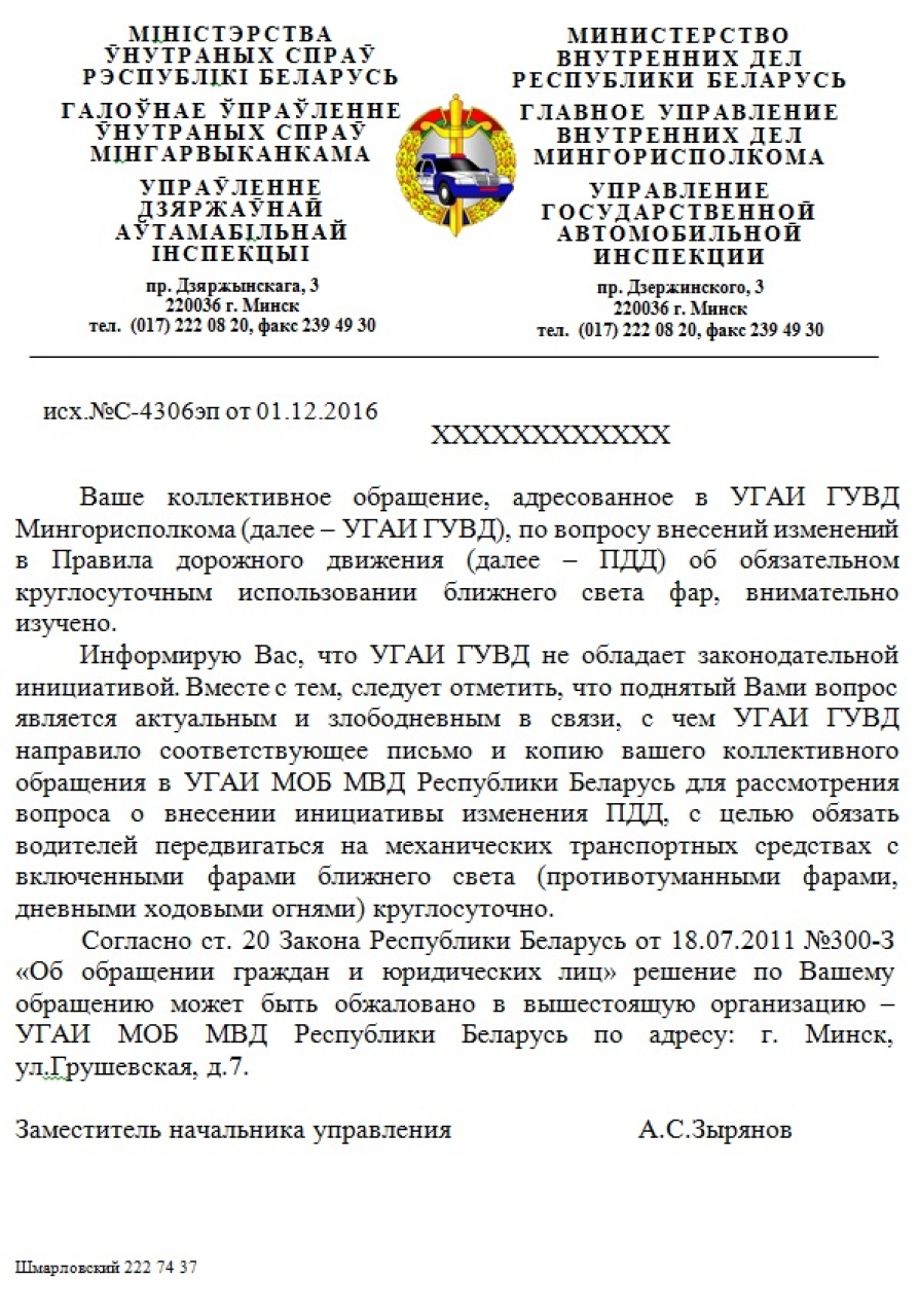 Так как поднятый вопрос является актуальным и злободневным, УГАИ ГУВД направило соответствующее письмо и копию коллективного обращения в УГАИ МОБ МВД Республики Беларусь для рассмотрения вопроса о внесении инициативы изменения ПДД, с целью обязать водителей передвигаться на механических транспортных средствах с включенными фарами ближнего света (противотуманными фарами, дневными ходовыми огнями) круглосуточно.