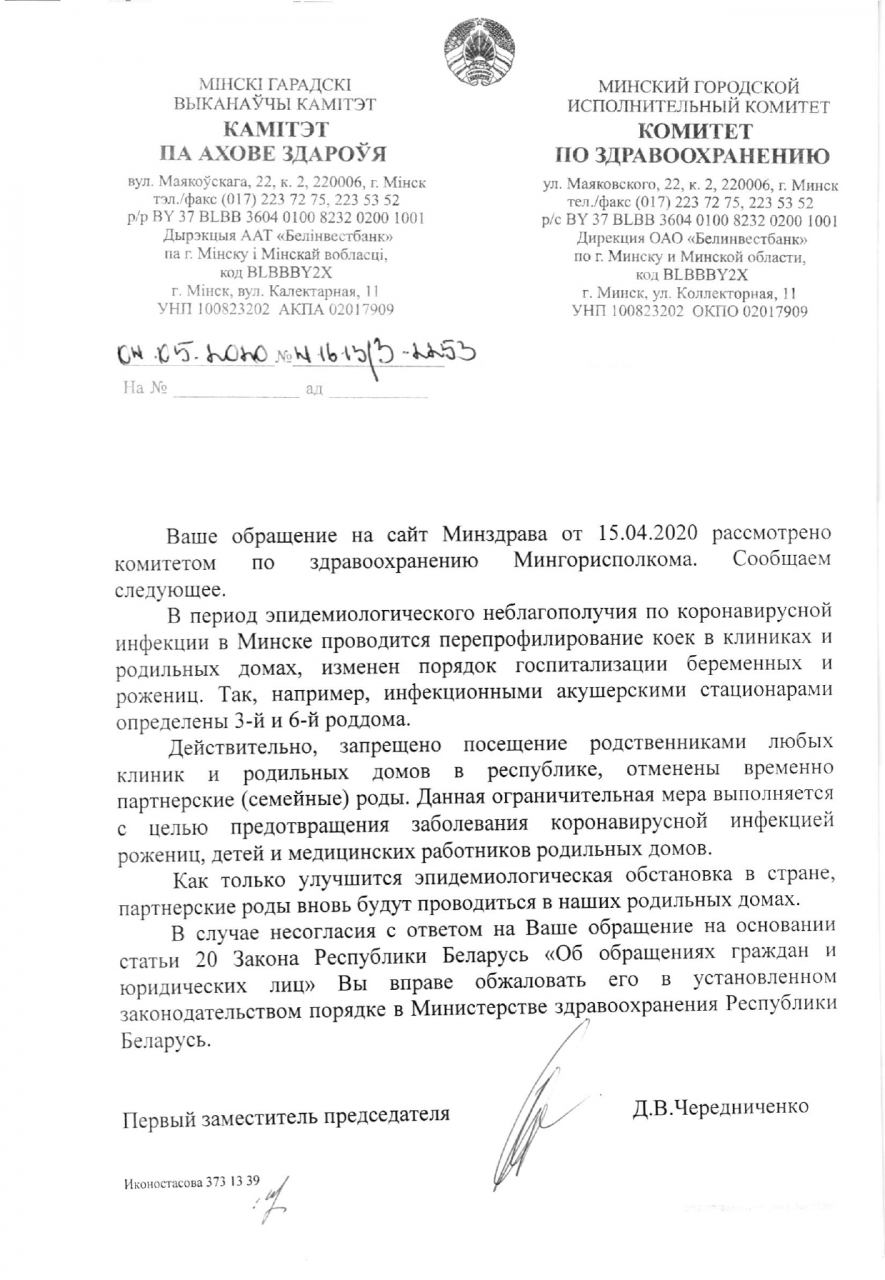 17 марта Комитет по здравоохранению Мингорисполкома издал приказ о временных ограничениях, которым отменил партнерские роды в перинатальных центрах города Минска «с целью предотвращения заболевания женского населения инфекцией COVID-19». Партнёрские роды к сегодняшнему дню также отменены и в других регионах Беларуси. Сначала «временные ограничения» были введены до 6 апреля, потом, по имеющейся у нас информации, продлены до 20 апреля, но это не точно – ограничения введены на неопределенный срок. Мы полагаем, что такие меры не логичны, чрезмерны, неблагоприятны для женщин, новорожденных и медперсонала.