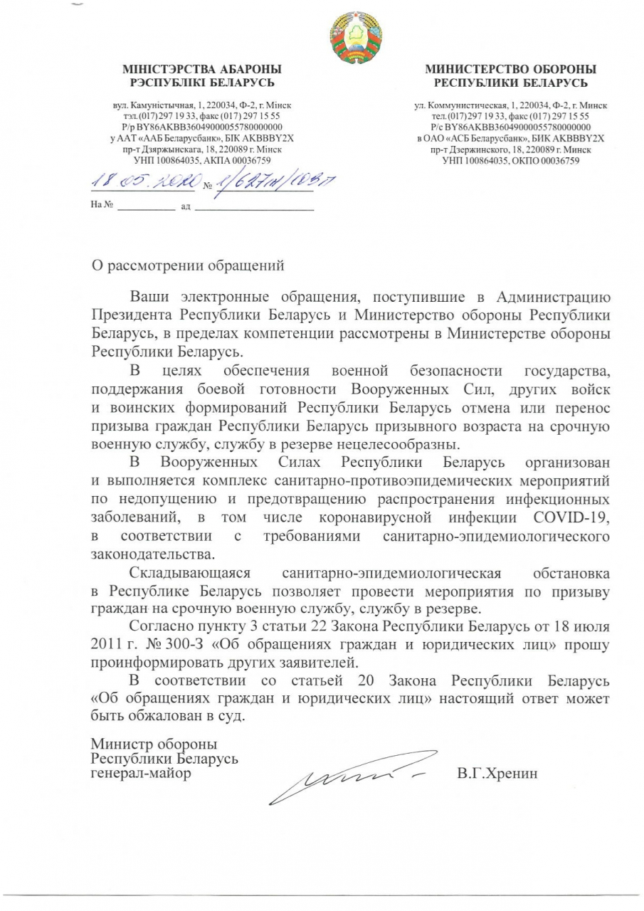 В связи с ситуацией в стране и во всём мире, связанной с пандемией коронавируса, прошу отменить\перенести весенний призыв в армию 2020 года, во избежание заболевания\заражения людей.