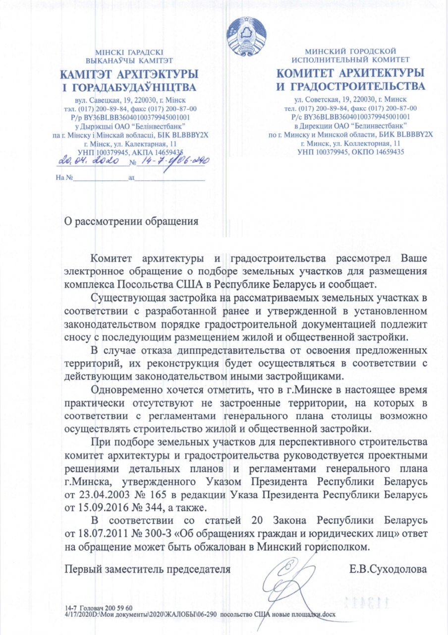 Согласно информации, представленной в статье https://realty.tut.by/news/building/679675.html, в Минске планируется строительство нового посольства США. Для строительства предложено четыре площадки, все они подразумевают снос для нужд стоительства. Первые две площадки занимают "сталинки", являющиеся исторической и культурной ценностью. Их дворы и сама территория примыкающая к этим зданиям может быть отнесена к рекреационной территории, поскольку она обладает высокой степенью озеленения и благоустройства ( в отличие от типовых микрорайонов современной застойки). Также в Минске хватает пустующих территорий.