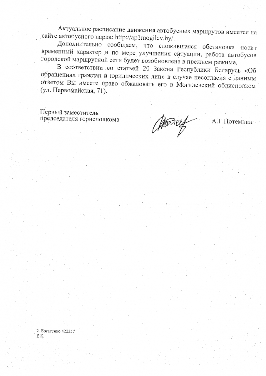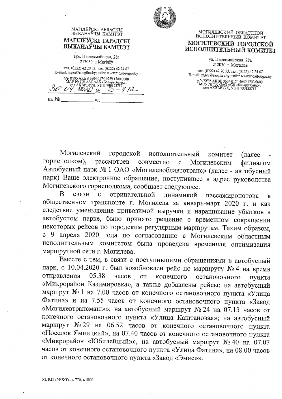 Мы жители и гости Могилёва, руководствуясь ст.41 Закона "О местном управлении и самоуправлении в Республике Беларусь", которая устанавливает, что исполкомы в пределах своей компетенции в порядке, установленном законодательством, создают условия для предоставления транспортных услуг населению и организуют транспортное обслуживание граждан на соответствующей территории, требуем вернуть все отменённые рейсы общественного транспорта в Могилёве в связи с неблагоприятной обстановкой, вызванной коронавирусом. Обращаем внимание, что ВОЗ рекомендует, чтобы расстояние между людьми составляло не менее 1 метра а у нас в городе и так транспорта не хватает.