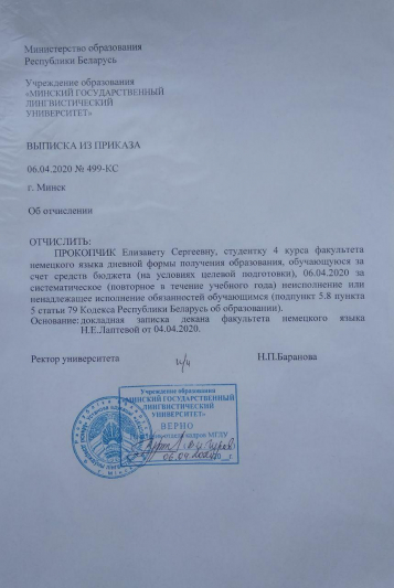 Мы полагаем, что данное отчисление является несправедливым, при этом ректор Минского государственного лингвистического университета Н.П. Баранова, а если необходимо, Министр образования И.В. Карпенко обязаны восстановить первую заявительницу настоящего обращения в её правах, отменив приказ ректора МГЛУ Н.П. Барановой №499-КС от 06.04.2020, исходя из полагаемой нами необоснованности и несправедливости, данного дисциплинарного взыскания.