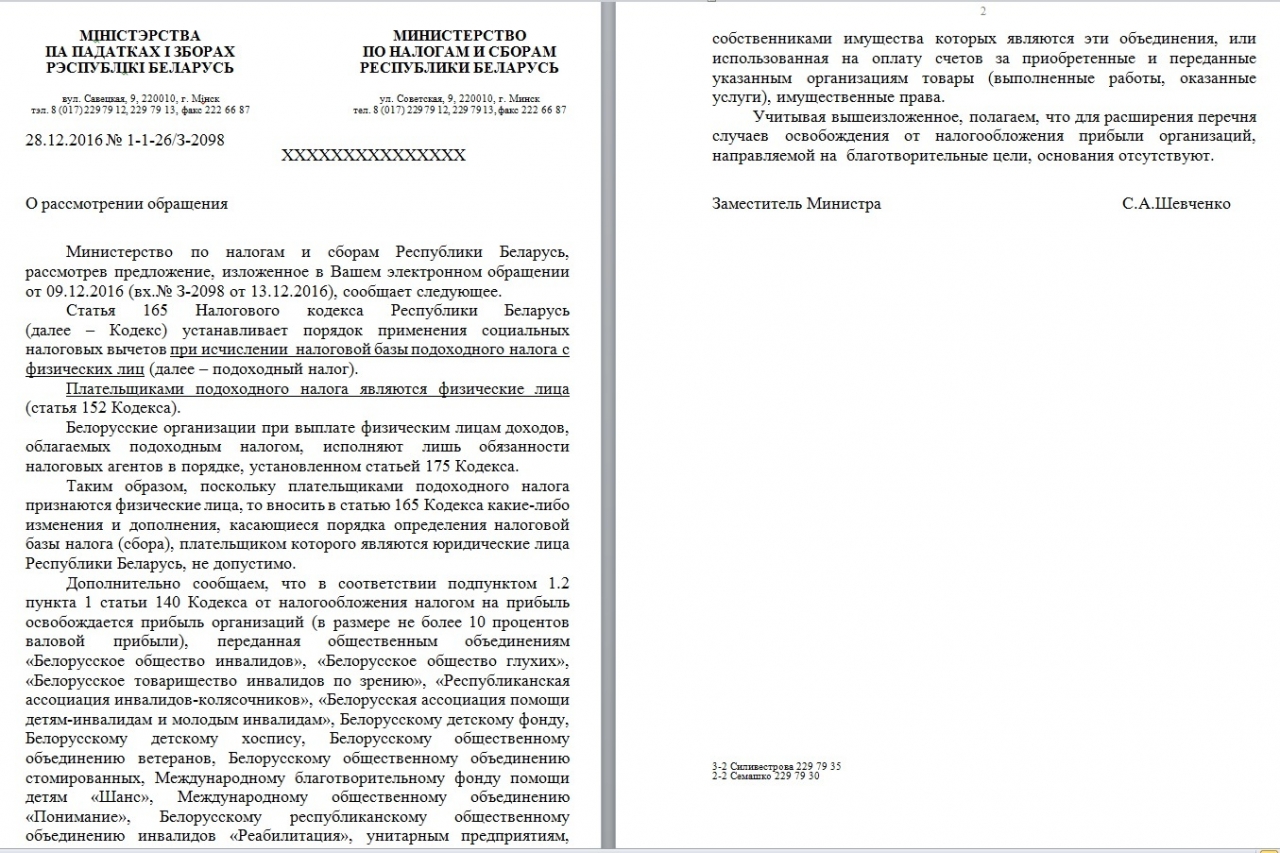 Для этого при доработке Налогового кодекса просим внести в парламент Республики Беларусь предложение о добавлении отчислений на благотворительность в статью 165. "Социальные налоговые вычеты" Налогового кодекса Республики Беларусь.