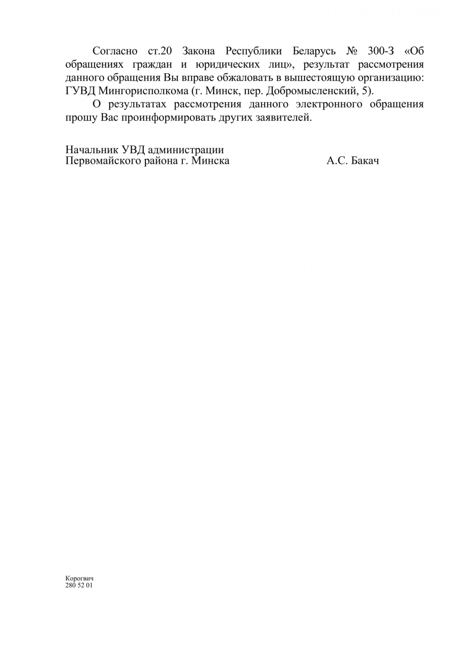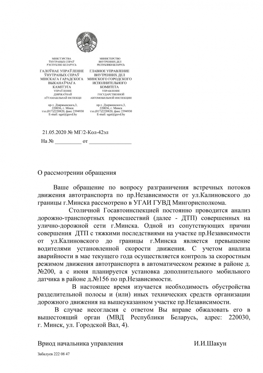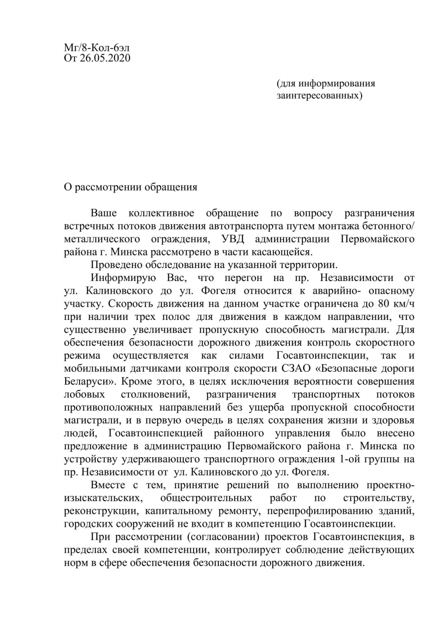 Госавтоинспекцией районного управления внесено предложение в администрацию Первомайского района г.Минска по устройству удерживающего транспортного ограждения 1-ой группы на пр. Независимости от ул.Калиновского до ул.Фогеля.