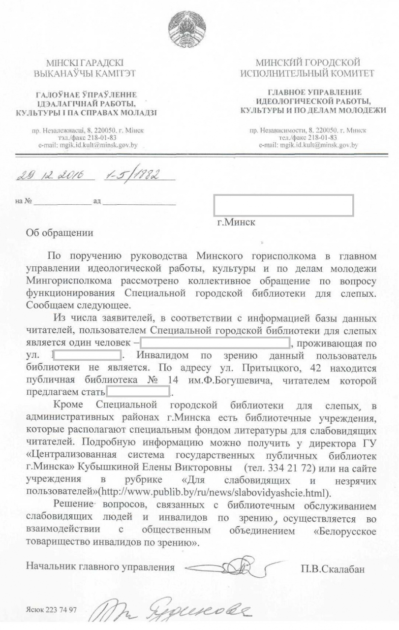 Мы, минчане, просим сохранить библиотеку на прежнем месте. Ее читателями являются около двух тысяч человек, половина из них инвалиды по зрению. Несмотря на то, что библиотека переносится на несколько остановок, для таких людей это огромная проблема. Сначала библиотека для слепых была на Амураторской, только дорогу освоили, ее перенесли. Теперь снова собираются перевозить. А слабовидящие люди запоминают и учат маршрут на слух, им сложно привыкать к новому маршруту.