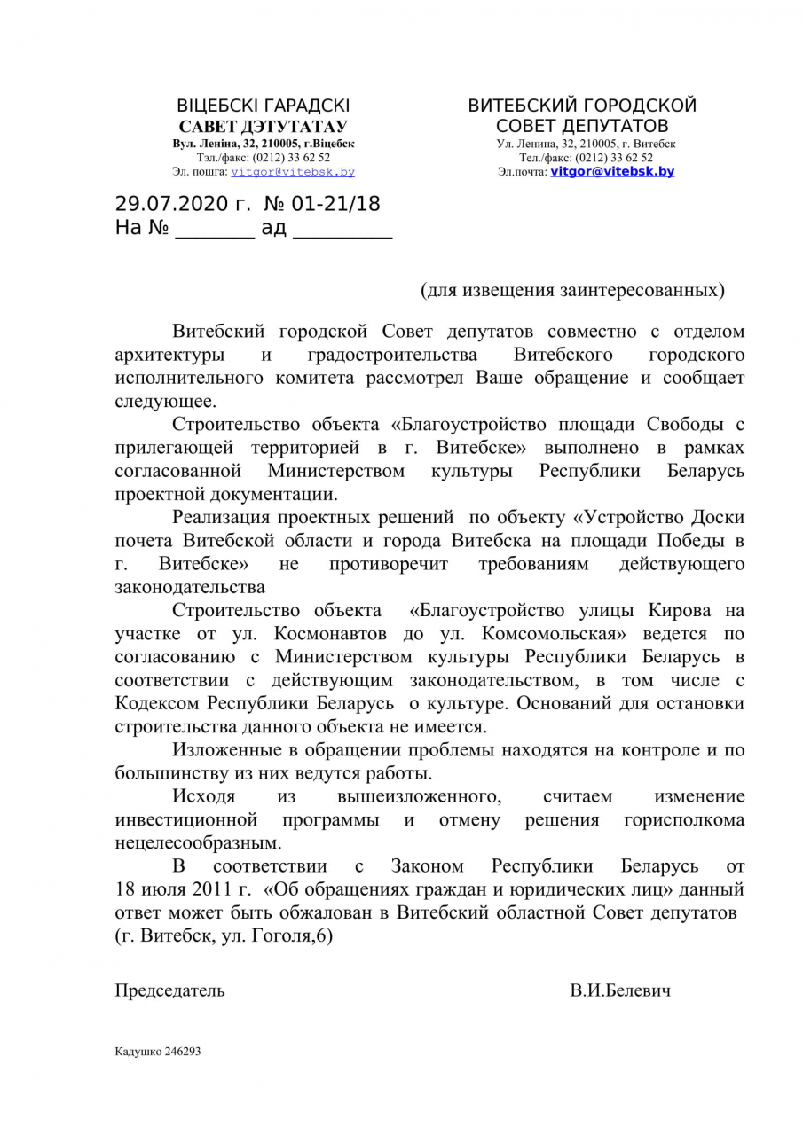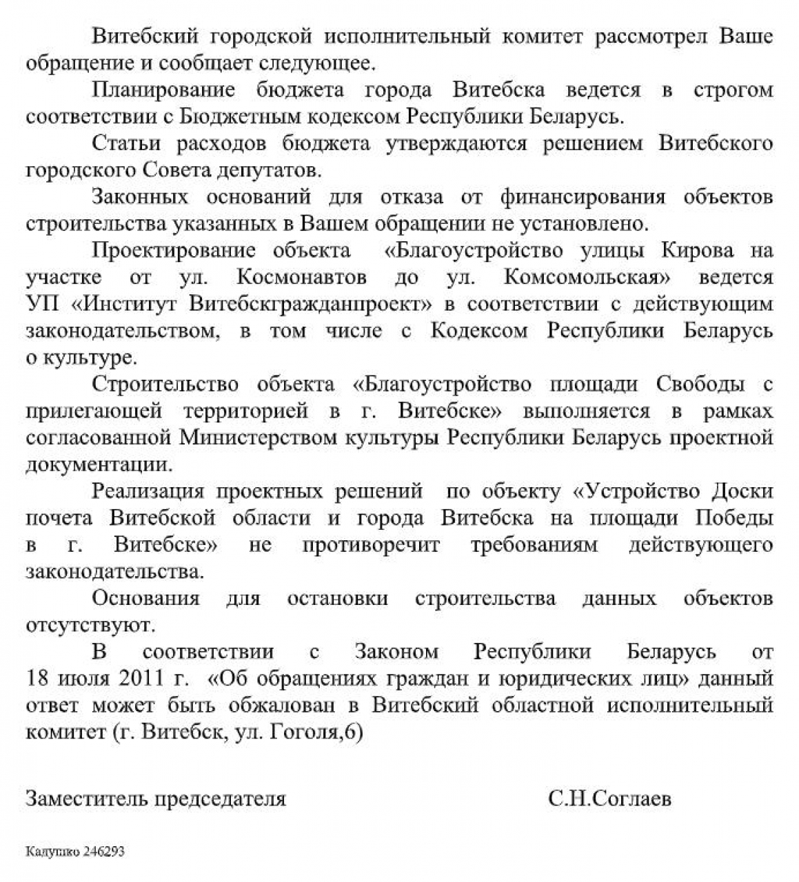 Мы, жители и гости Витебска, требуем отказаться от нецелесообразных, на наш взгляд, трат из бюджета города Витебска на работы стоимостью миллионы рублей: