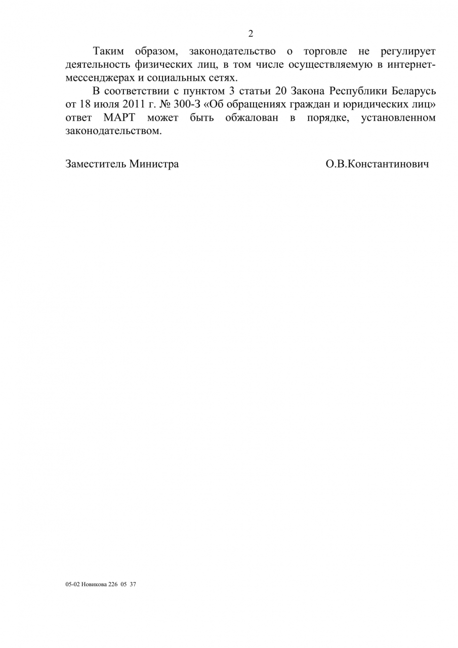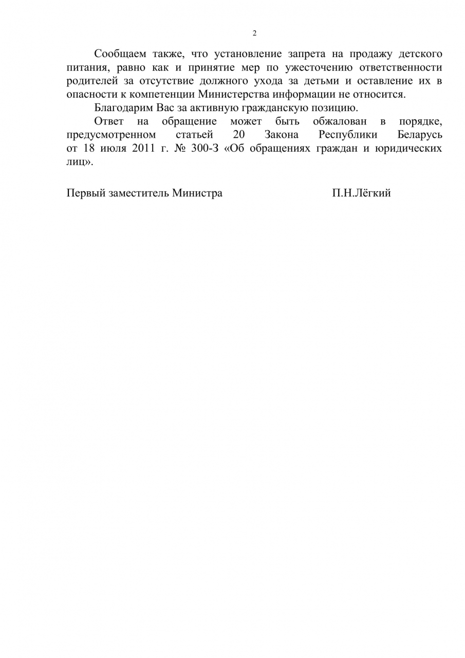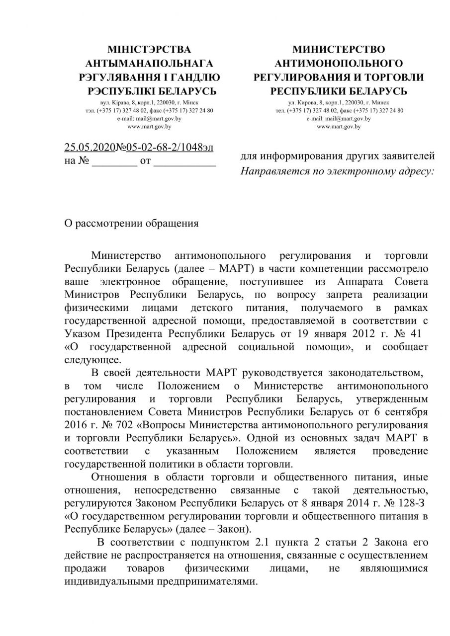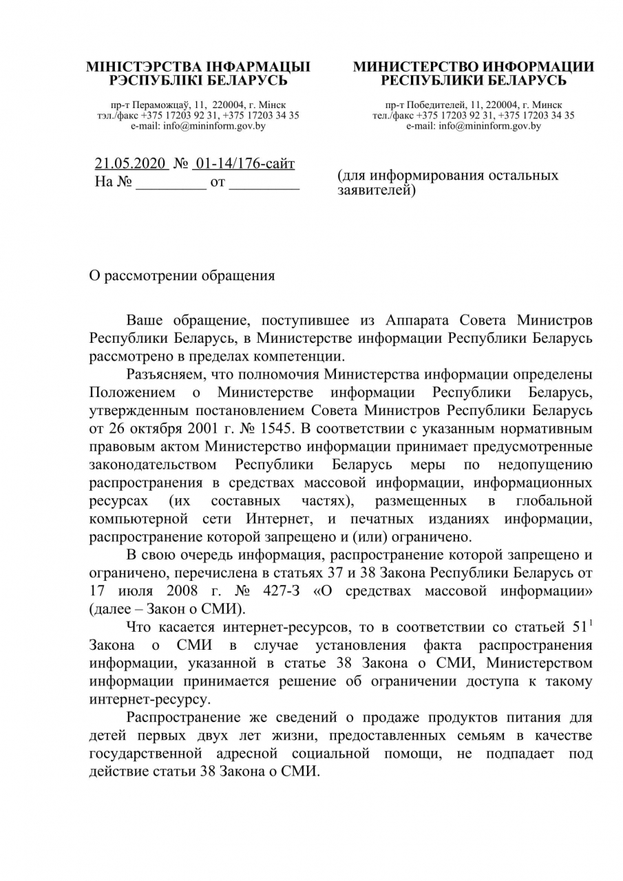 Распространение сведений о продаже продуктов питания для детей первых двух лет жизни, предоставленных семьям в качестве государственной адресной социальной помощи, не подпадает под действие ст.38 Закона о СМИ, для того чтобы Министерством информации принималось решение об ограничении доступа к интернет-ресурсу, где размещены подобные сведения.