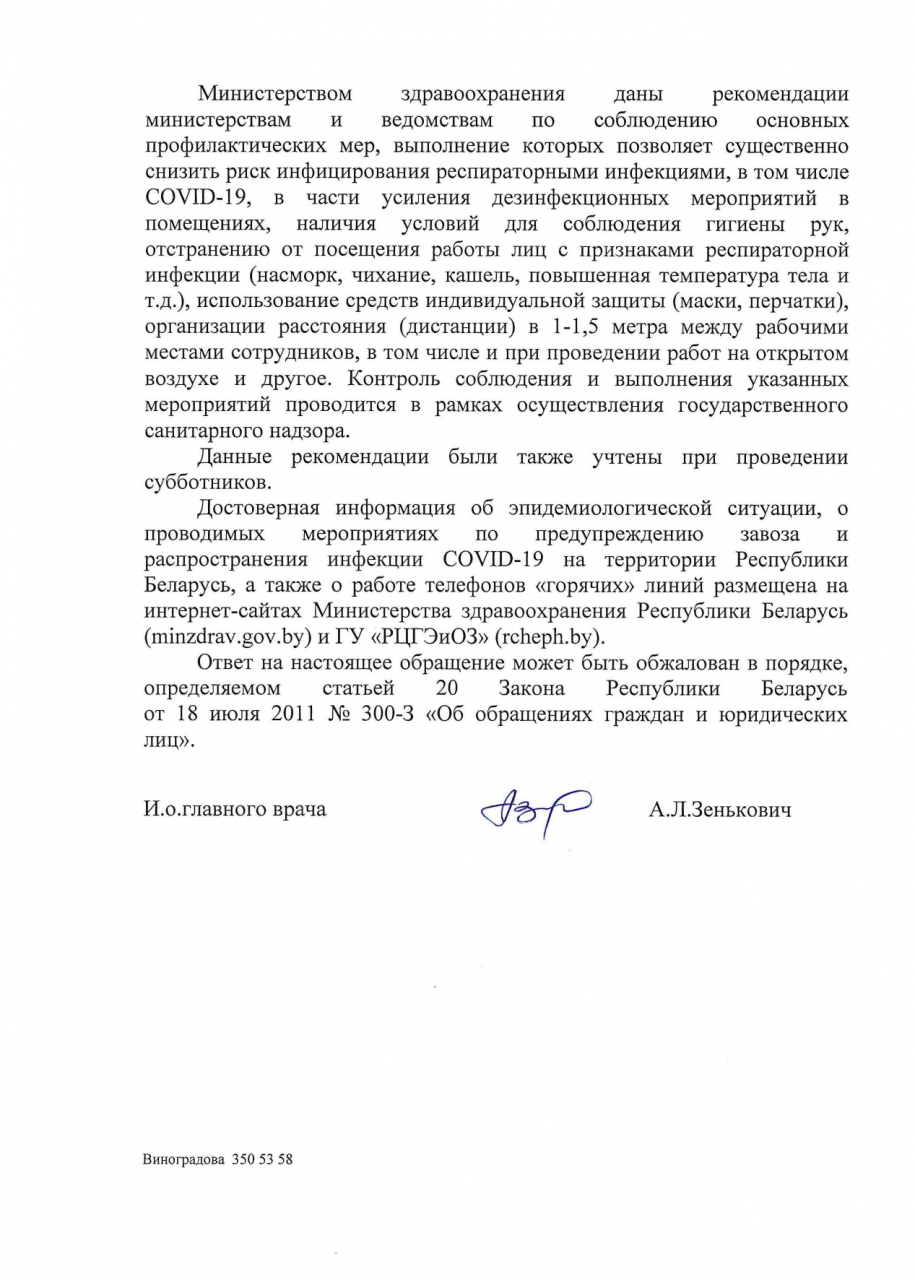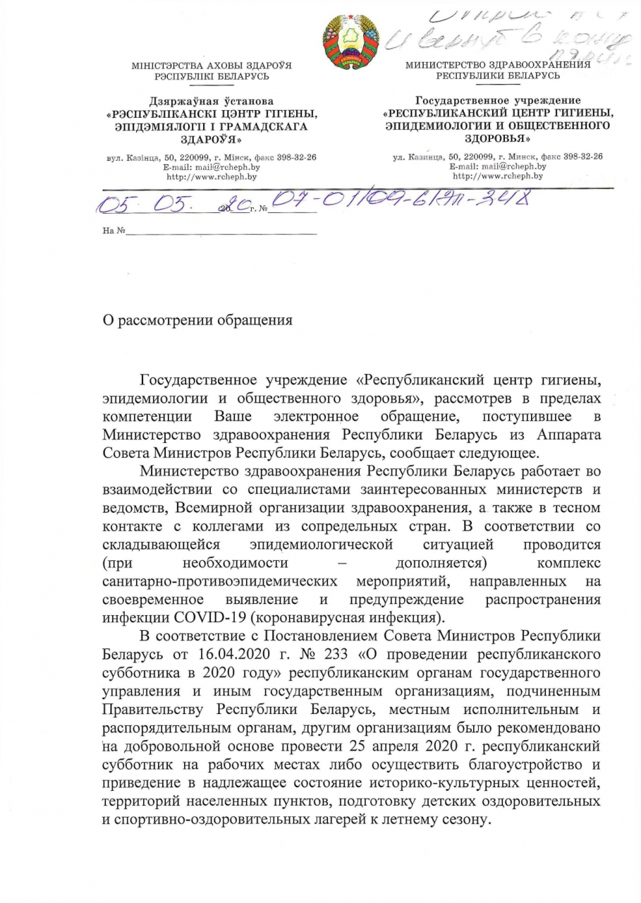 В связи с этим, просим Совет Министров и Министерство здравоохранения Республики Беларусь выполнить рекомендации Всемирной организации здравоохранения, и отказаться от проведения субботника и других массовых мероприятий, не являющихся жизненно важными для страны.