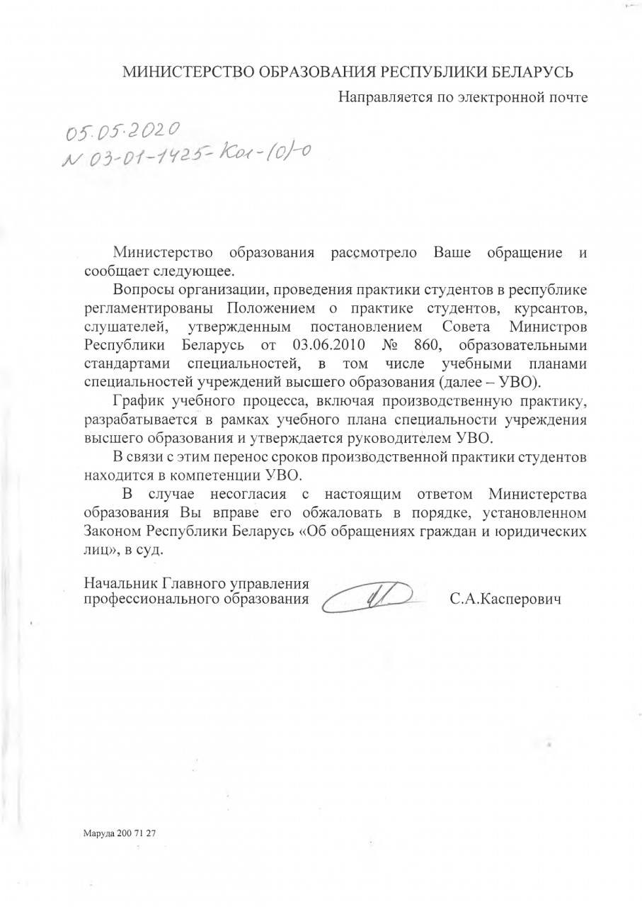 В связи со сложившейся эпидемиологической обстановкой в мире и Республике Беларусь, для сокращения степени распространения коронавируса и в целях заботы о здоровье граждан, необходимо перенести сроки производственных практик для всех студентов, до улучшения ситуации.