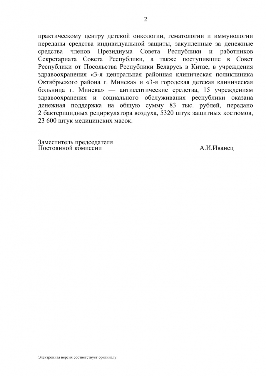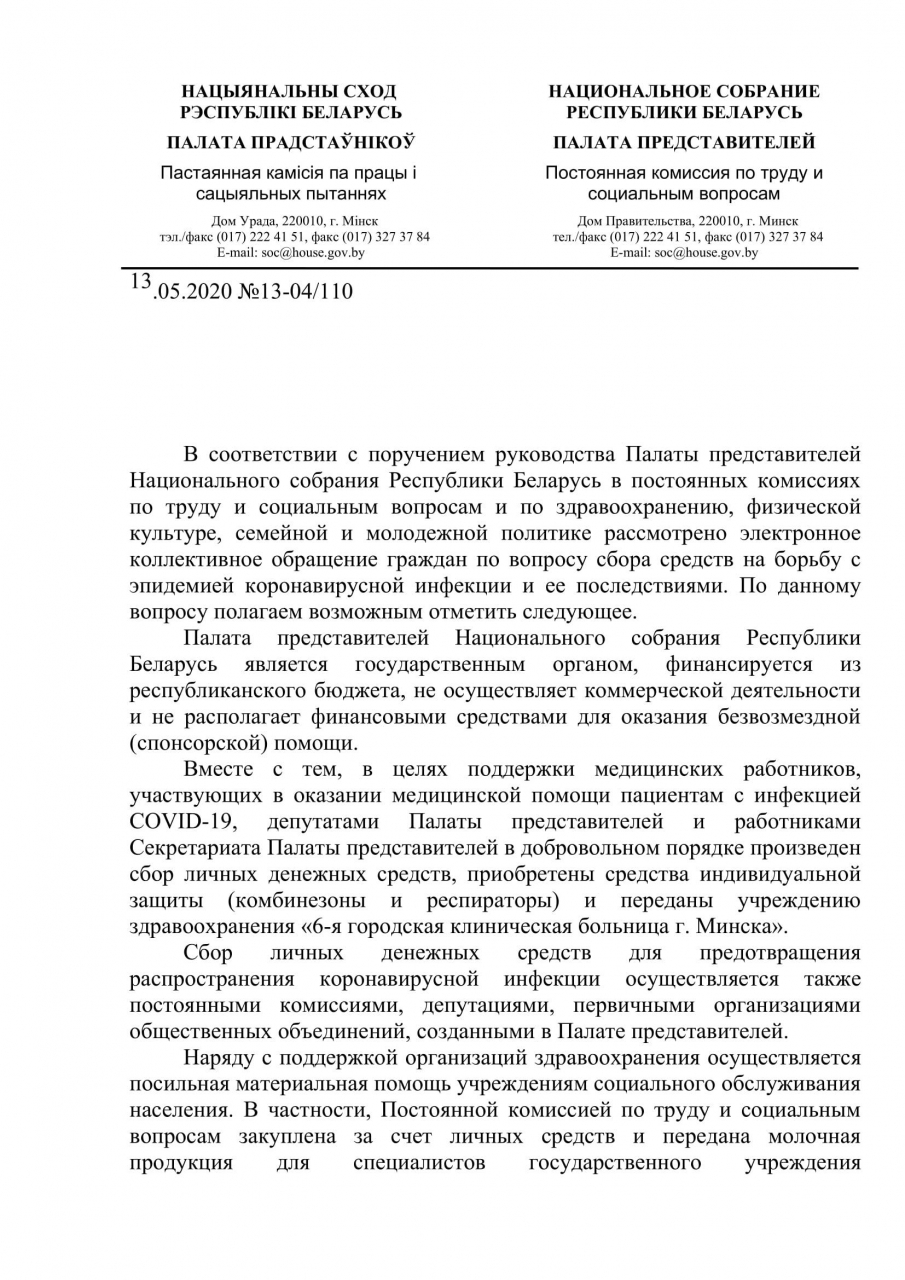 В целях поддержки медицинских работников, участвующих в оказании медицинской помощи пациентам с инфекцией COVID-19, депутатами Палаты представителей и работниками Секретариата Палаты представителей в добровольном порядке произведен сбор личных денежных средств, приобретены средства индивидуальной защиты (комбинезоны и респираторы) и переданы учреждению здравоохранения «6-я городская клиническая больница г. Минска».