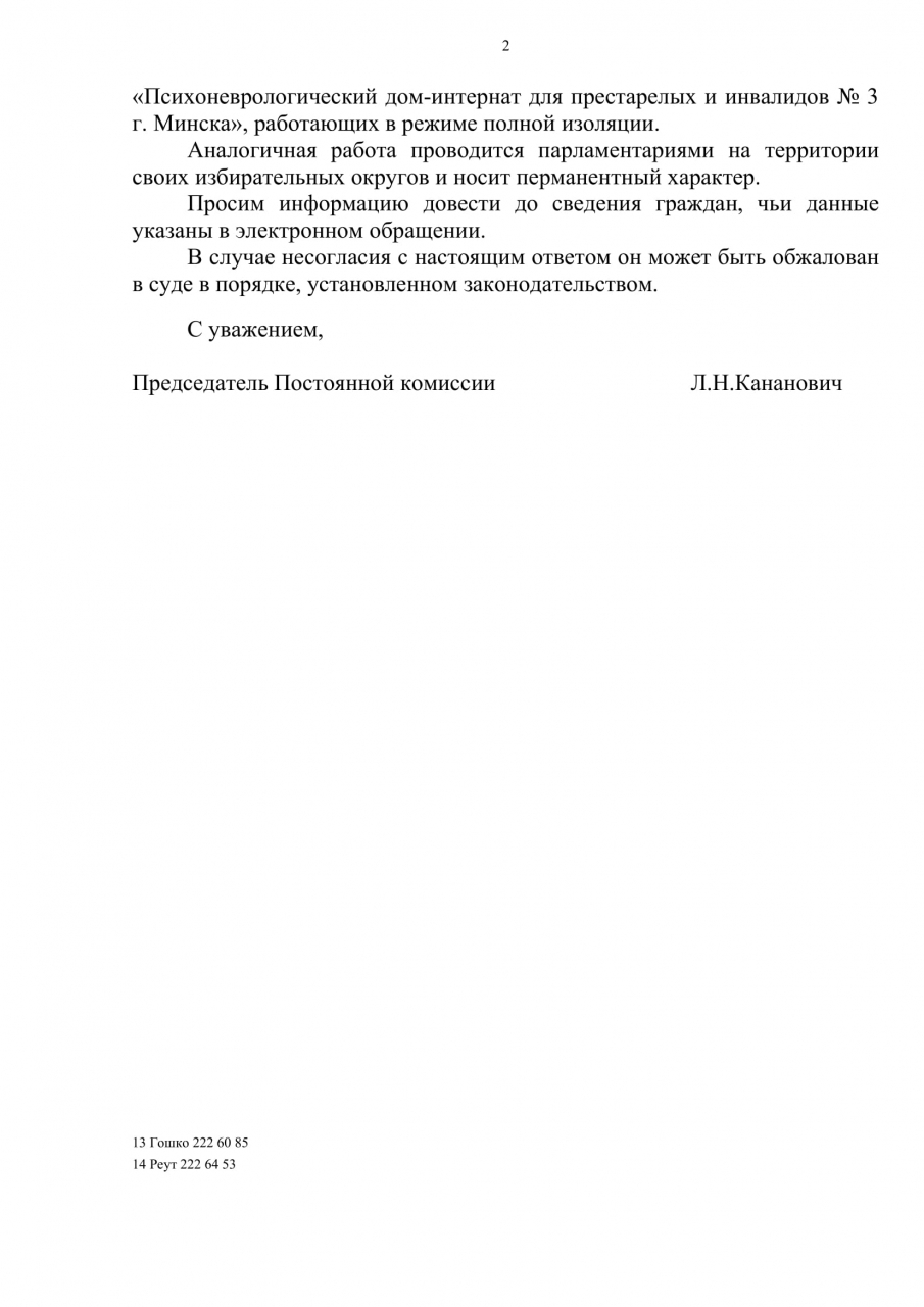 Уважаемые парламентарии! Обращаясь к Вам 05.12.2019 года, А. Г. Лукашенко назвал Вас элитой нашего общества и напутствовал: «Доказывайте людям делом, что вы достойны этого высокого звания». Мы призываем Вас в период эпидемии коронавируса и последующий период восстановления экономики направлять определенную часть Ваших зарплат на борьбу с эпидемией и ее последствиями. Такой поступок будет важным вкладом в противостояние COVID-19.