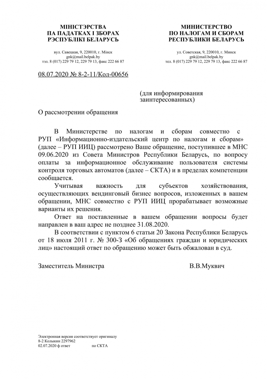 РУП «Информационно-издательский центр по налогам и сборам» прорабатывает возможные варианты решения вопросов, изложенных в обращении. Ответ на поставленные в обращении вопросы будет направлен в адрес заявителей не позднее 31.08.2020.