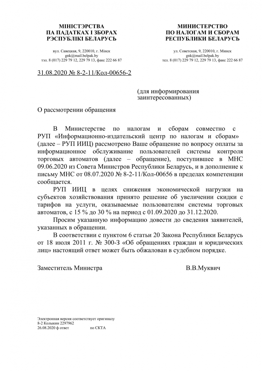 UPD. РУП «Информационно-издательский центр по налогам и сборам» в целях снижения экономической нагрузки на субъектов хозяйствования принято решение об увеличении скидки с тарифов на услуги, оказываемые пользователям системы торговых автоматов, с 15 % до 30 % на период с 01.09.2020 до 31.12.2020.