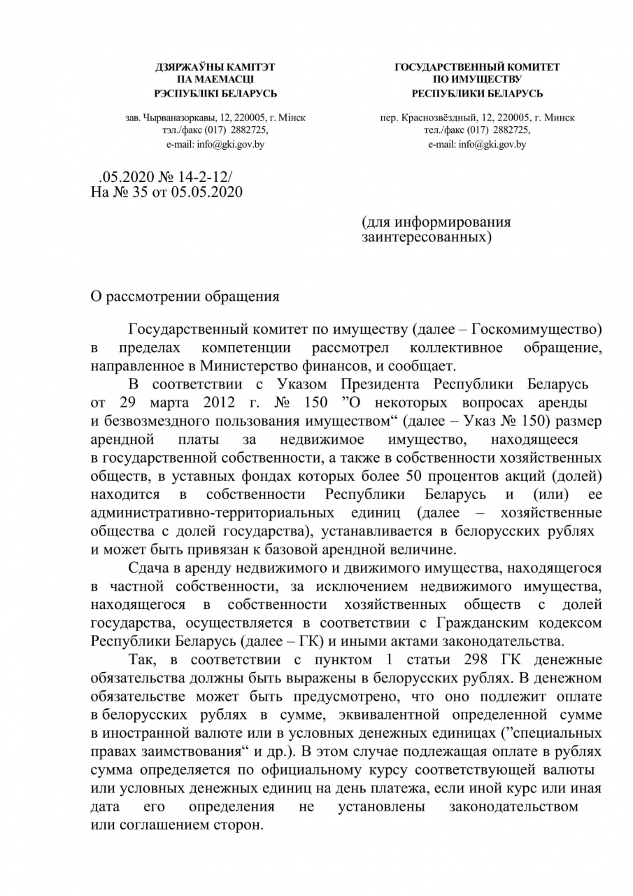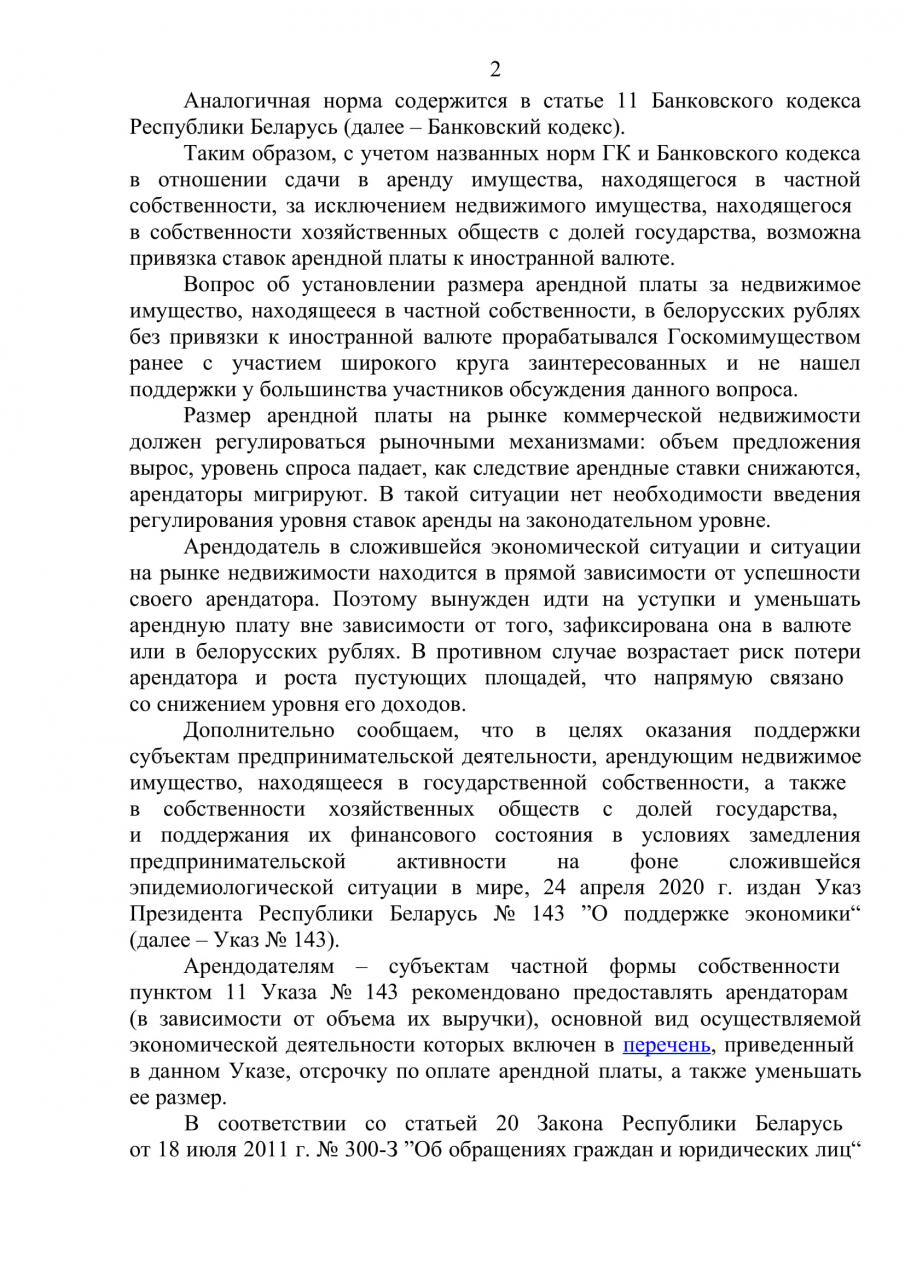 ограничить привязку ставки арендной платы к доллару США/евро для субъектов хозяйствования (арендодателей), которые не использовали валютные кредиты при финансировании строительства соответствующего помещения либо выплатили кредитные платежи по валютным кредитам, и обязать арендодателей привязывать ставку арендной платы к базовой арендной величине, действующей в Республике Беларусь.