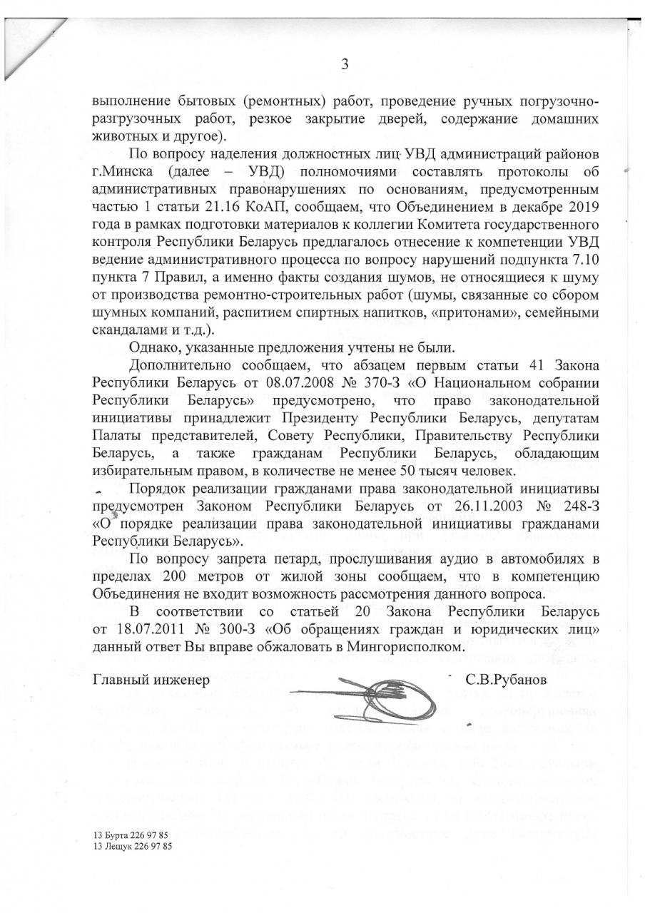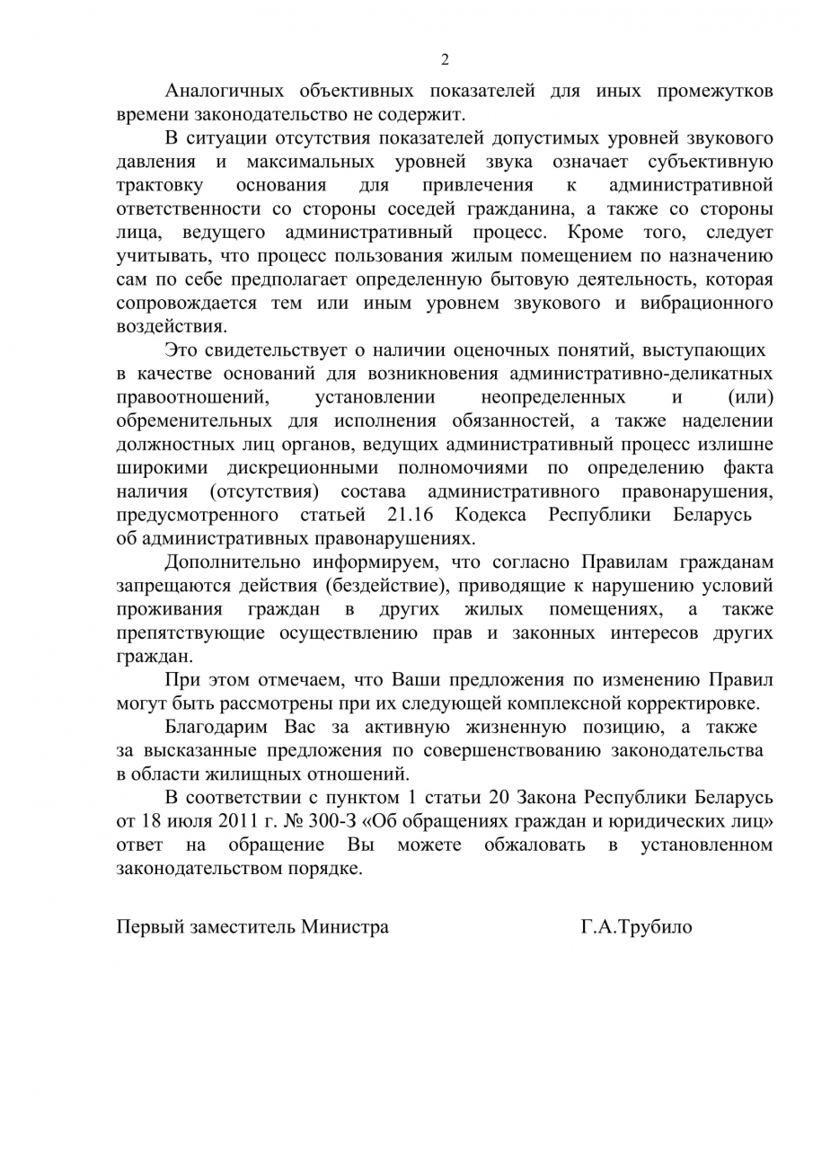 Считаем, что в Правилах пользования жилыми помещениями отсутствуют нормы по пользованию жилыми помещениями в дневное время (c 7:00 до 23:00), что создаёт возможность другим жильцам шуметь как угодно и как угодно громко. При этом их действия не подпадают ни под какие нарушения и ПИКоАП не может быть к ним применен. В квартирах некоторых граждан может быть сильный источник шума в дневное время, и если они не идут на диалог, никакие обращения в ЖЭО ни в ЖРЭО не помогают, и сделать что-либо в данной ситуации становится просто невозможно.