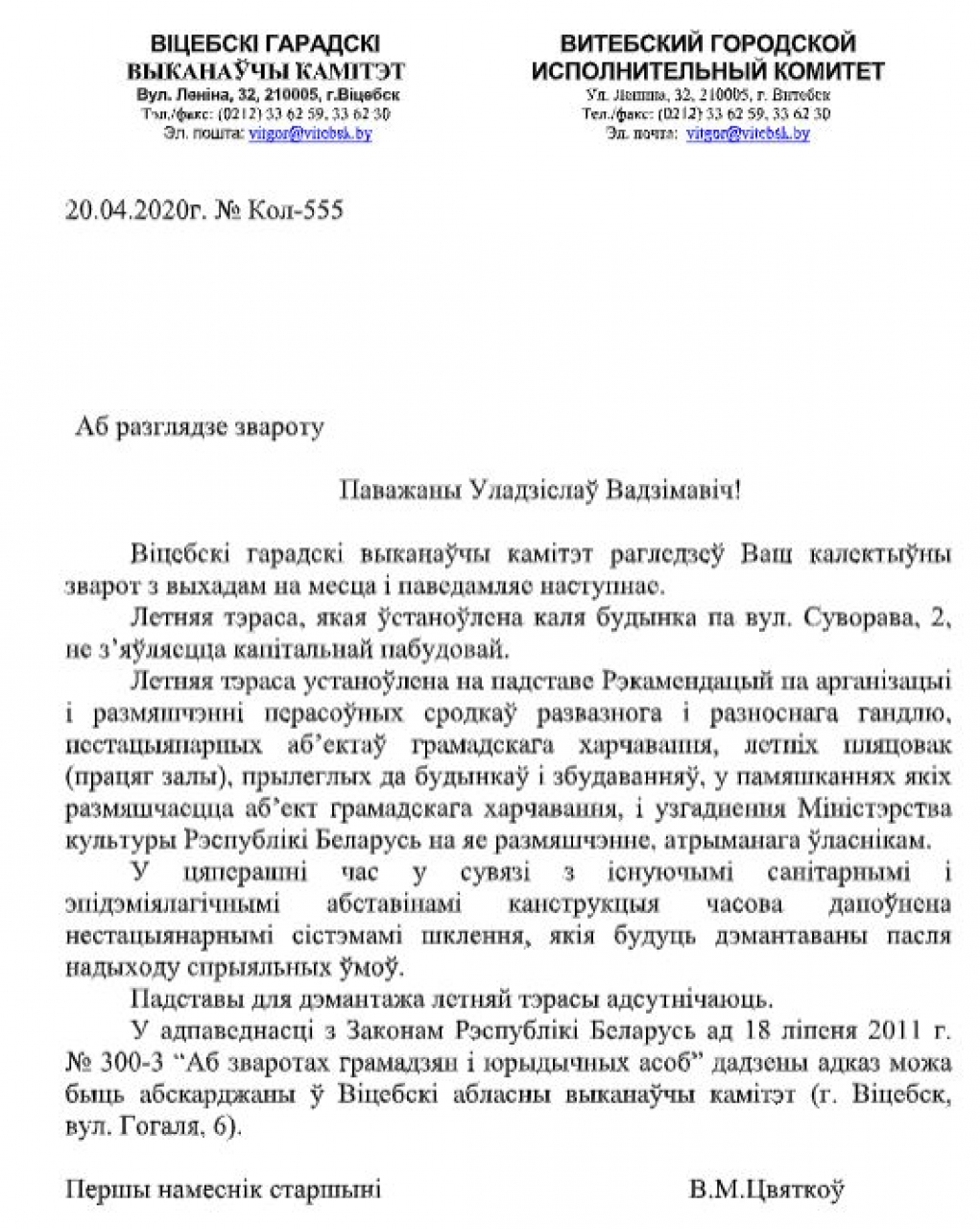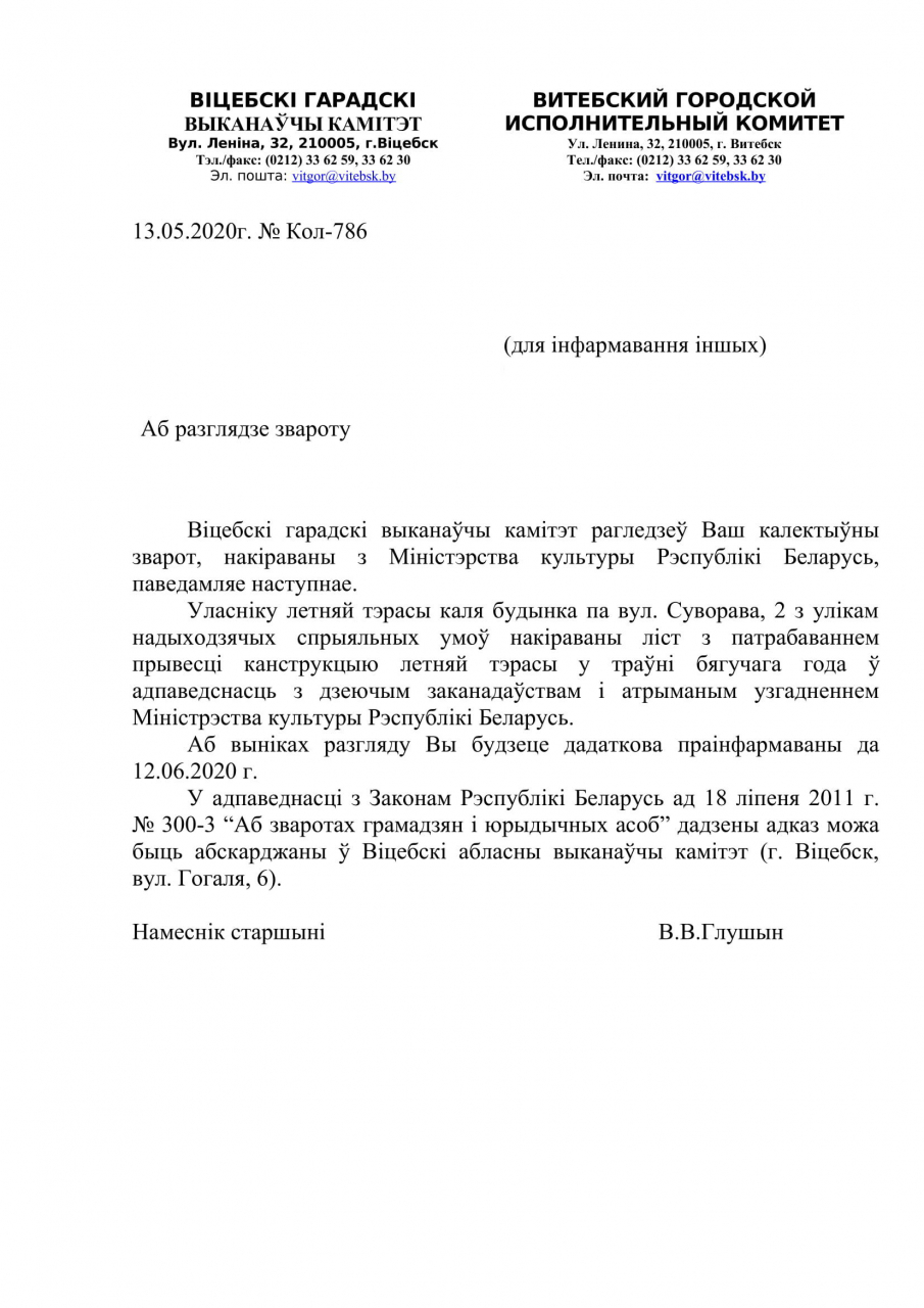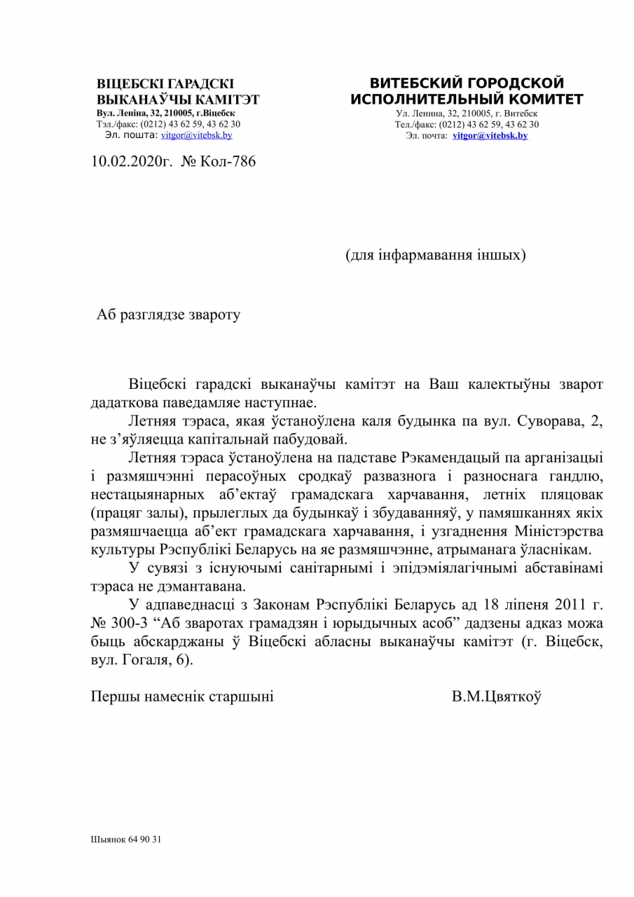 20 красавіка 2020 мною атрыманы адказ на электронны зварот (копія прыкладаецца). У калектыўным звароце звярталася ўвага на тое, што ў Віцебску перад галоўным фасадам будынка былых гандлёвых радоў канца ХVIII стагоддзя па вул. Суворава, 2, які з’яўляецца гісторыка-культурнай каштоўнасцю 3-й катэгорыі (шыфр 213Г000077) нядаўна была ўстаноўлена капітальная «летняя тэраса», якая ўяўляе сабой паўнавартаснае памяшканне, контур якога закрыты з усіх бакоў. Прапаноўвалася дэмантаваць новаўстаноўленую тэрасу.