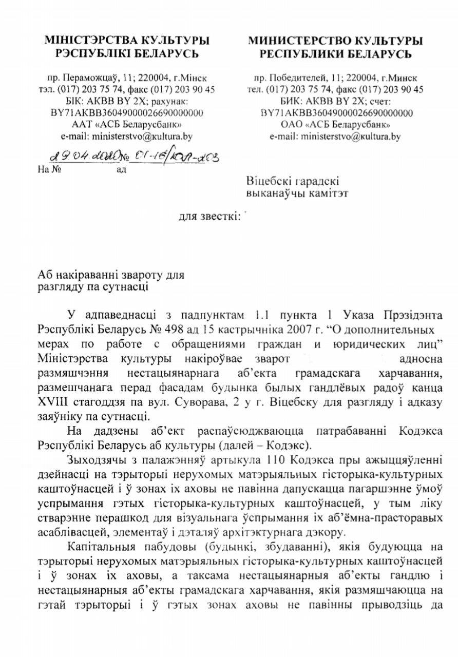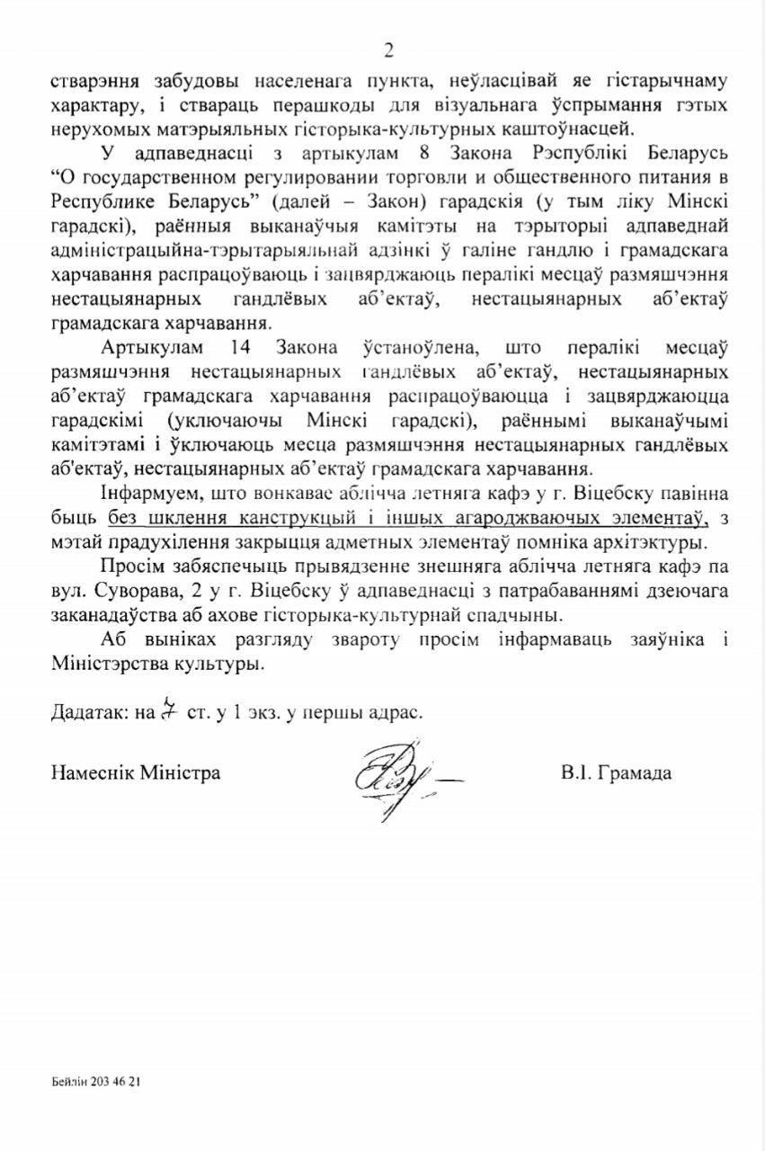 Прашу Мінкультуры растлумачыць Віцебскаму гарвыканкаму палажэнні заканадаўства наконт летніх тэрас перад фасадамі гісторыка-культурных каштоўнасцей.