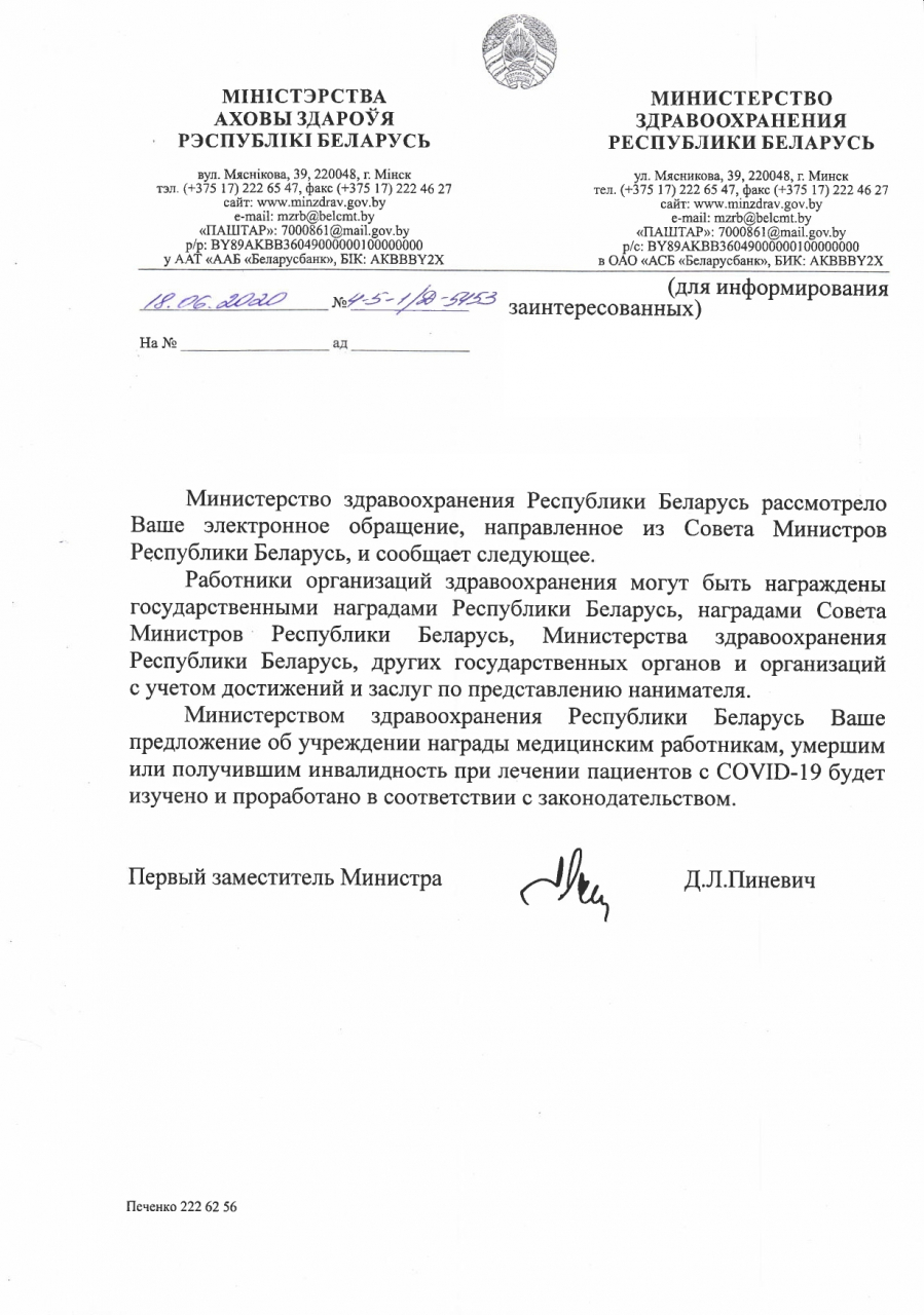 Предложение об учреждении награды медработникам, умершим или получившим инвалидность при лечении пациентов с COVID-19, будет изучено и проработано в соответствии с законодательством.