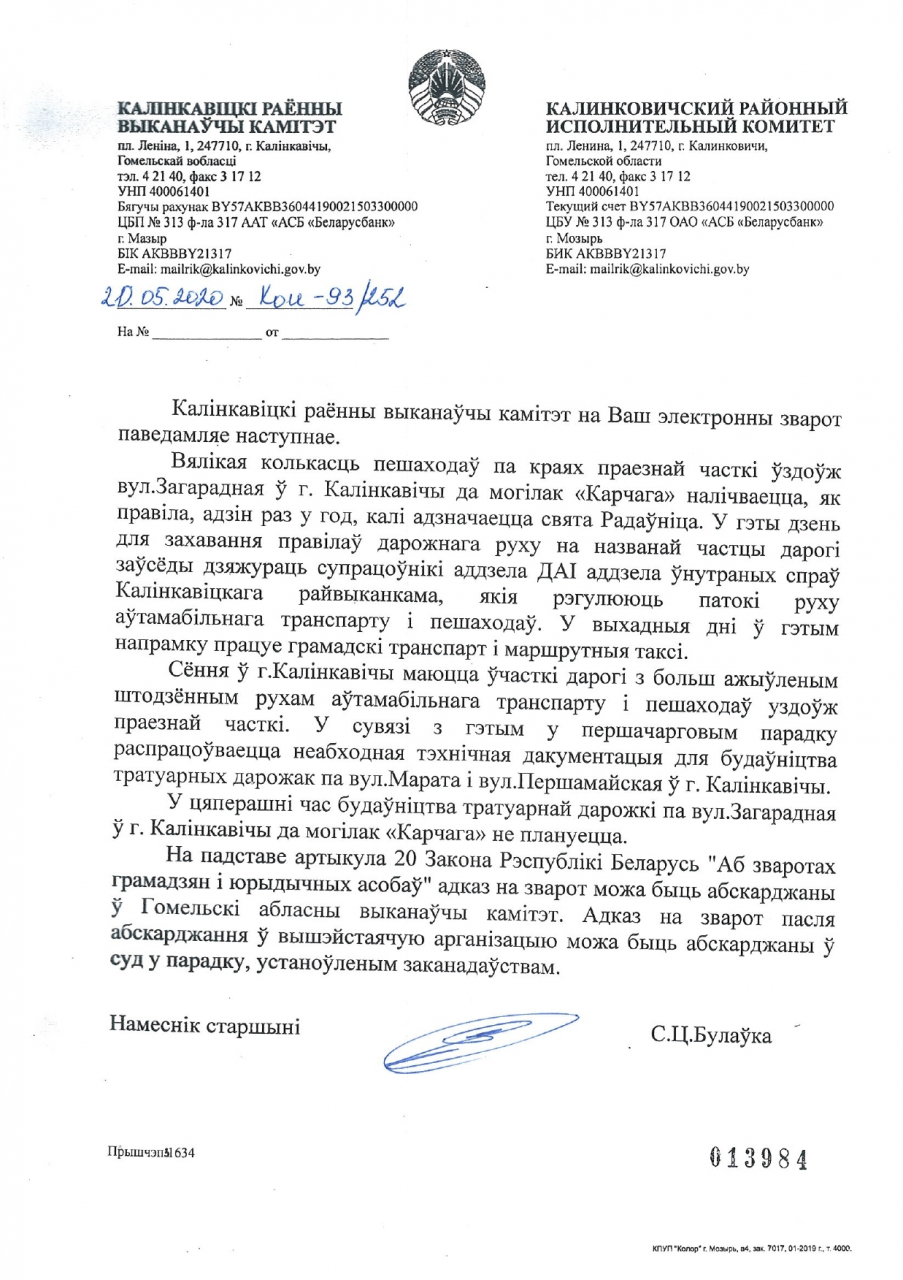 Мы, тыя, хто падпісаў гэты зварот, патрабуем адшукаць магчымасці і прыняць захады па ўладкаванні на адрэзку вуліцы Загарадная ад скрыжавання з вуліцай Веры Харужай да пляцоўкі каля ўезду на могілкі «Карчага» ў горадзе Калінкавічы пешаходнай дарожкі.