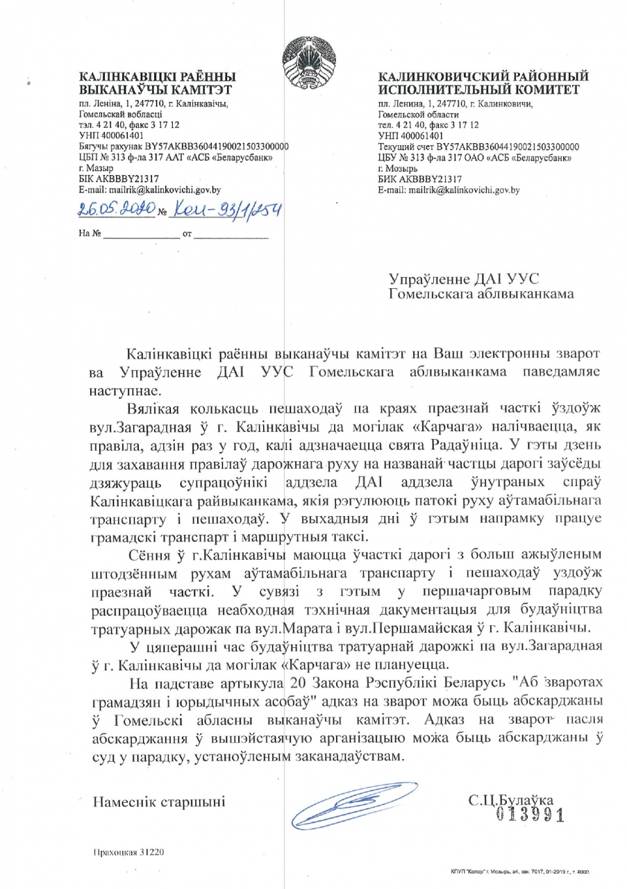 У цяперашні час будаўніцтва тратуарнай дарожкі па вул.Загарадная да могілак "Карчага" не плануецца.