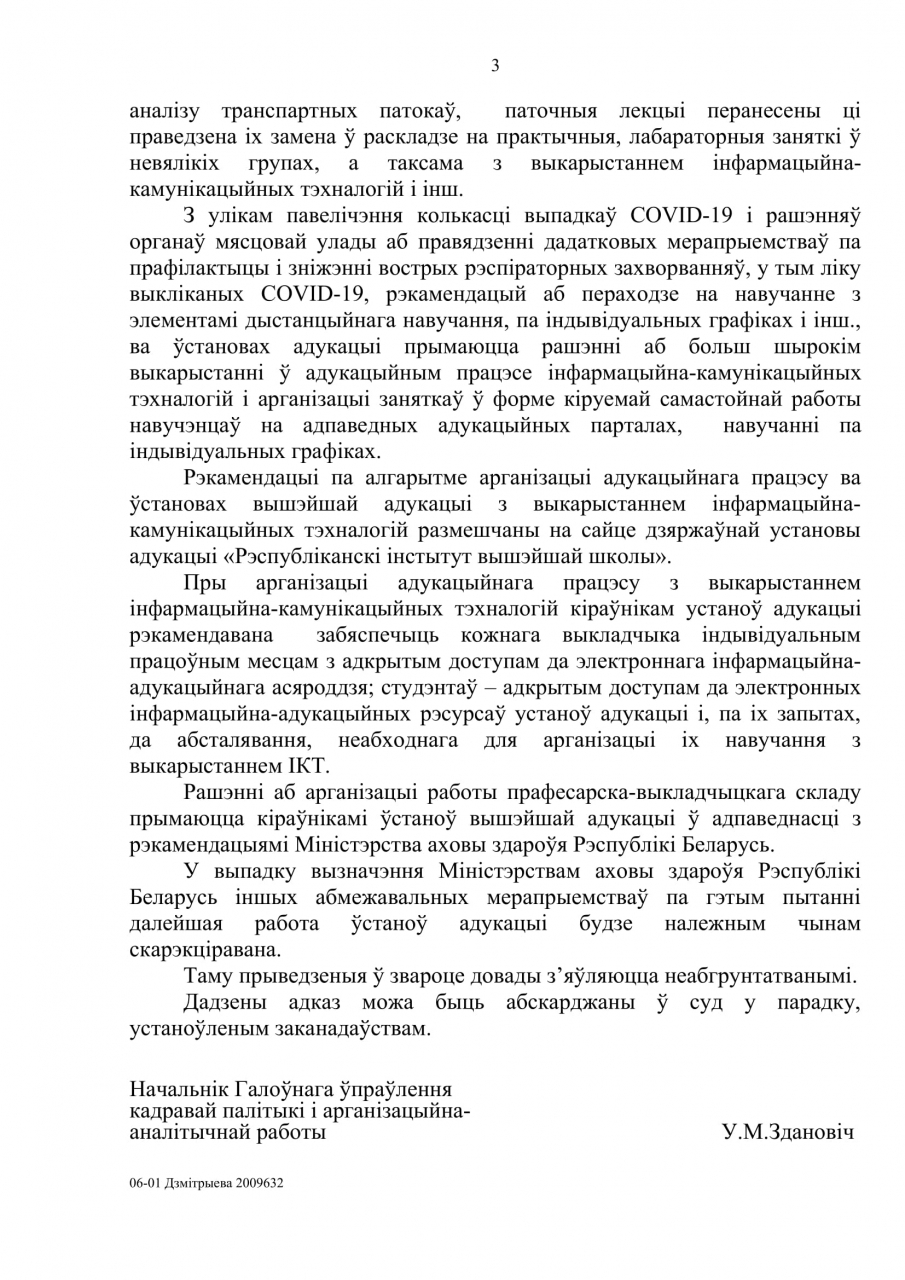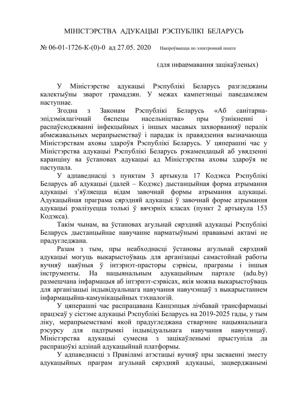 У сувязі з вышэй пералічанымі абставінамі лічым, што Міністр адукацыі Ігар Карпенка павінен сысці ў адстаўку, а ў краіне павінна быць арганізавана дыстанцыйнае навучанне з улікам усіх пералічаных у звароце пунктаў.