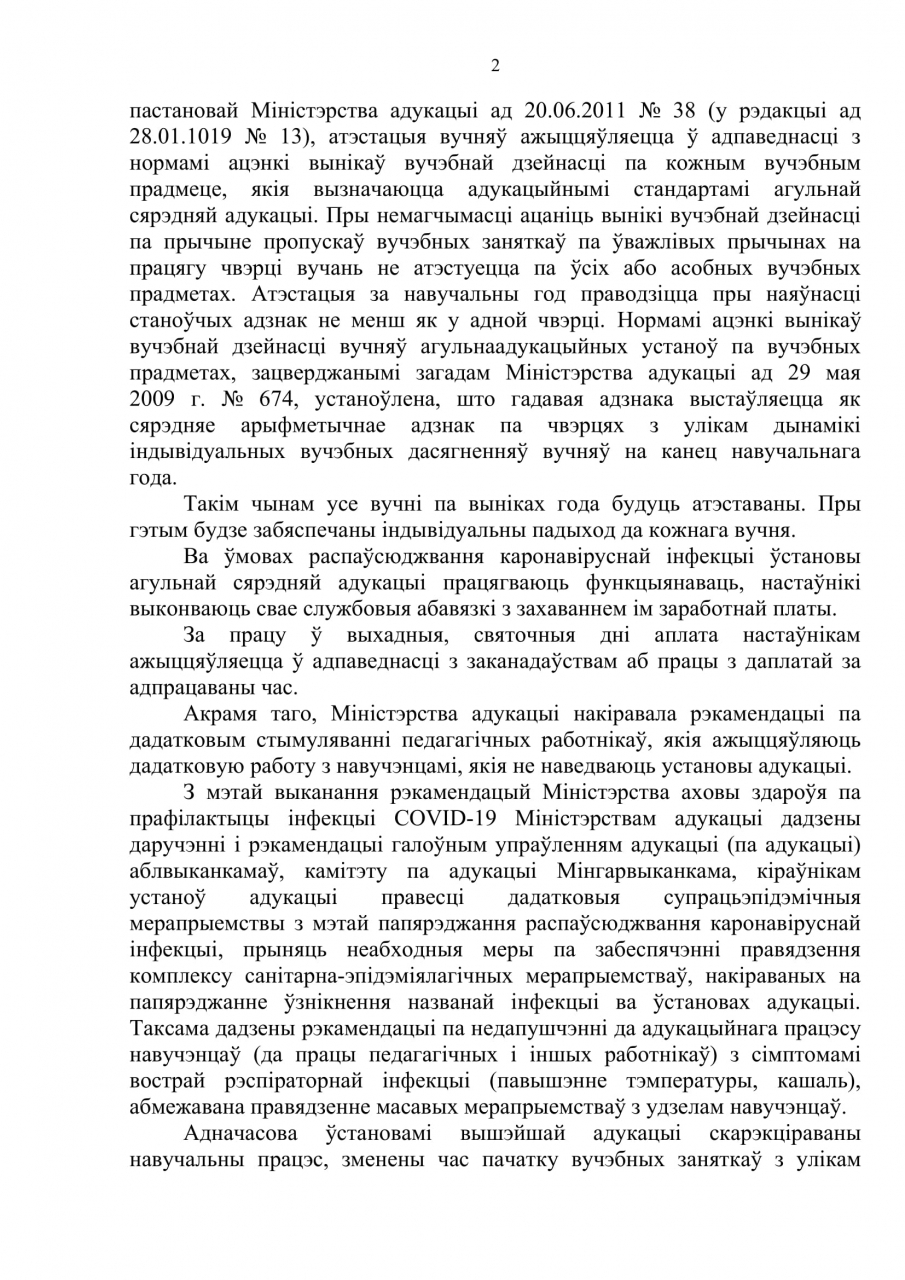 Па-пятае, інструкцыя праводзіць атэстацыю школьнікаў за тры чвэрці са складаннем сярэдніх балаў за тры чвэрці і дзяленнем гэтых балаў на чатыры (для тых, хто не ходзіць у школу ў чацвёртай чвэрці праз самаізаляцыю), мяркуем, з'яўляецца дыскрымінацыйнай у дачыненні да школьнікаў і з'яўляецца ідэалагічнай, каб падштурхнуць бацькоў адпраўляць вучняў на заняткі, чым ацэньваць іх веды па адзнакам.