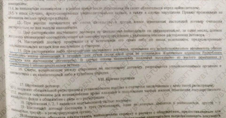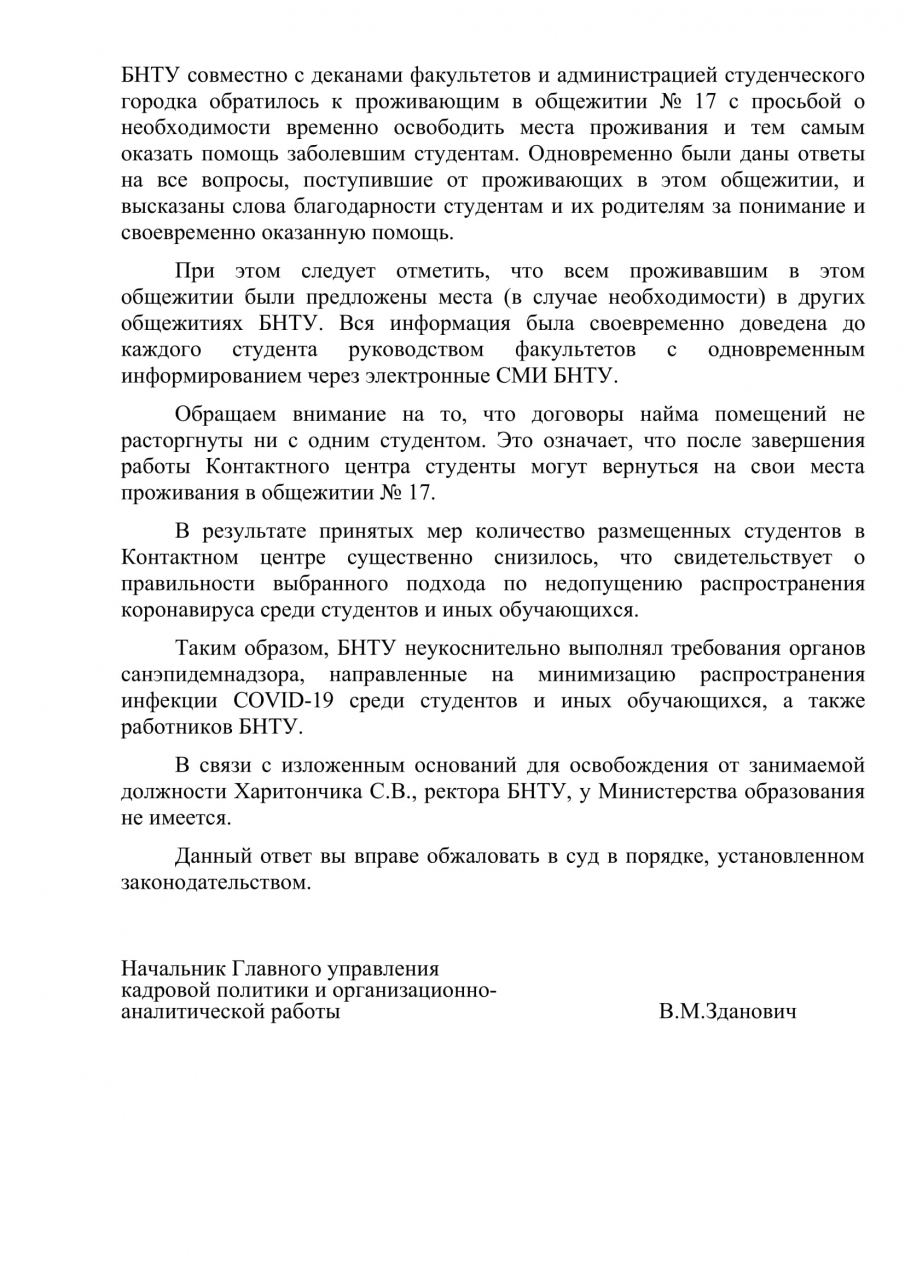 Нынешний ректор принимает решения, которые нарушают уже ранее подписанные документы. Так срочное выселение студентов БНТУ из 17-го общежития противоречит 15 пункту 6 главы договора, который заключается со студентами при заселении в общежитие, где написано, что «при расторжении либо прекращении настоящего договора, признании его недействительным наниматель обязан освободить жило помещение в течение трёх суток». Также принятое решение вынуждает студентов нарушить их обязательство находится в самоизоляции по месту жительства, которые было зафиксировано в заявлениях с просьбой перевести их на индивидуальное обучение с использованием информационно-коммуникационных технологий в связи со сложившейся эпидемиологической обстановкой.