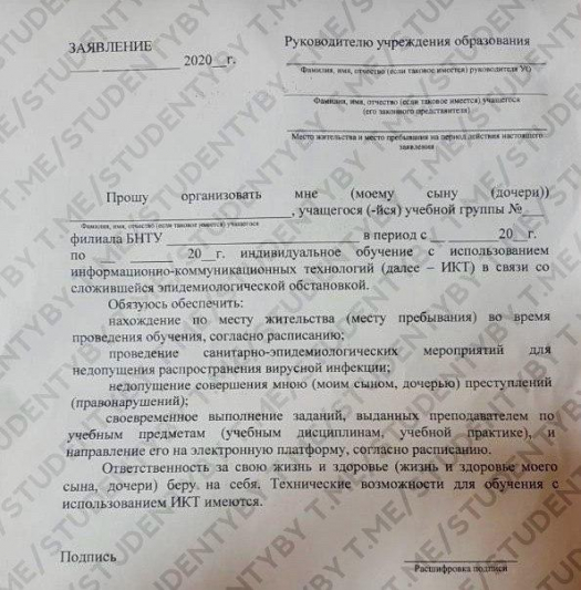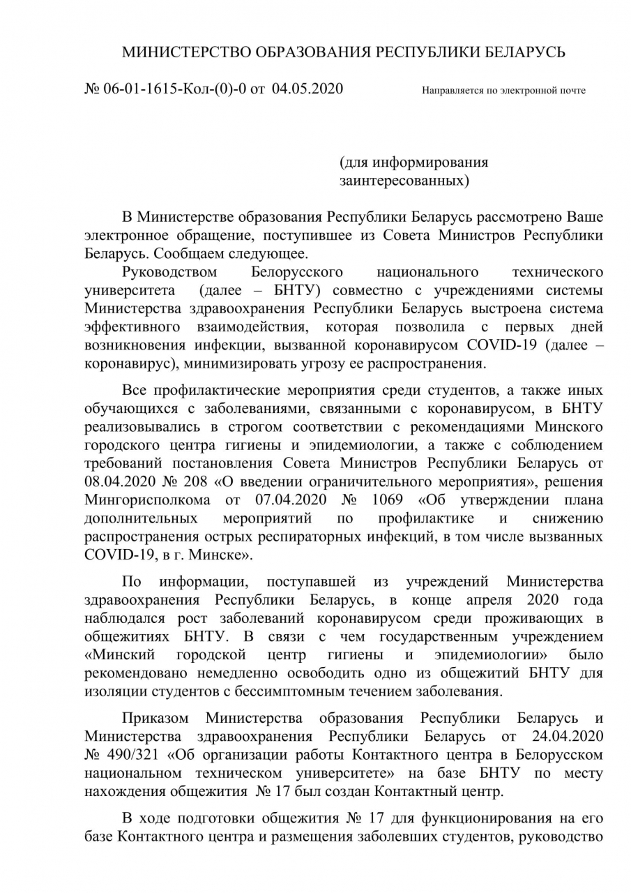 В связи с тем, что в последнее время участились случаи заражения коронавирусом среди студентов БНТУ (только по официальной информации ректората БНТУ более 25 случаев, а по информации от студентов больше 100 на 26.04), а также по причине попустительства и отсутствия налаженного управления ректоратом БНТУ, мы, нижеподписавшиеся, просим отправить в отставку ректора Белорусского национального технического университета Харитончика