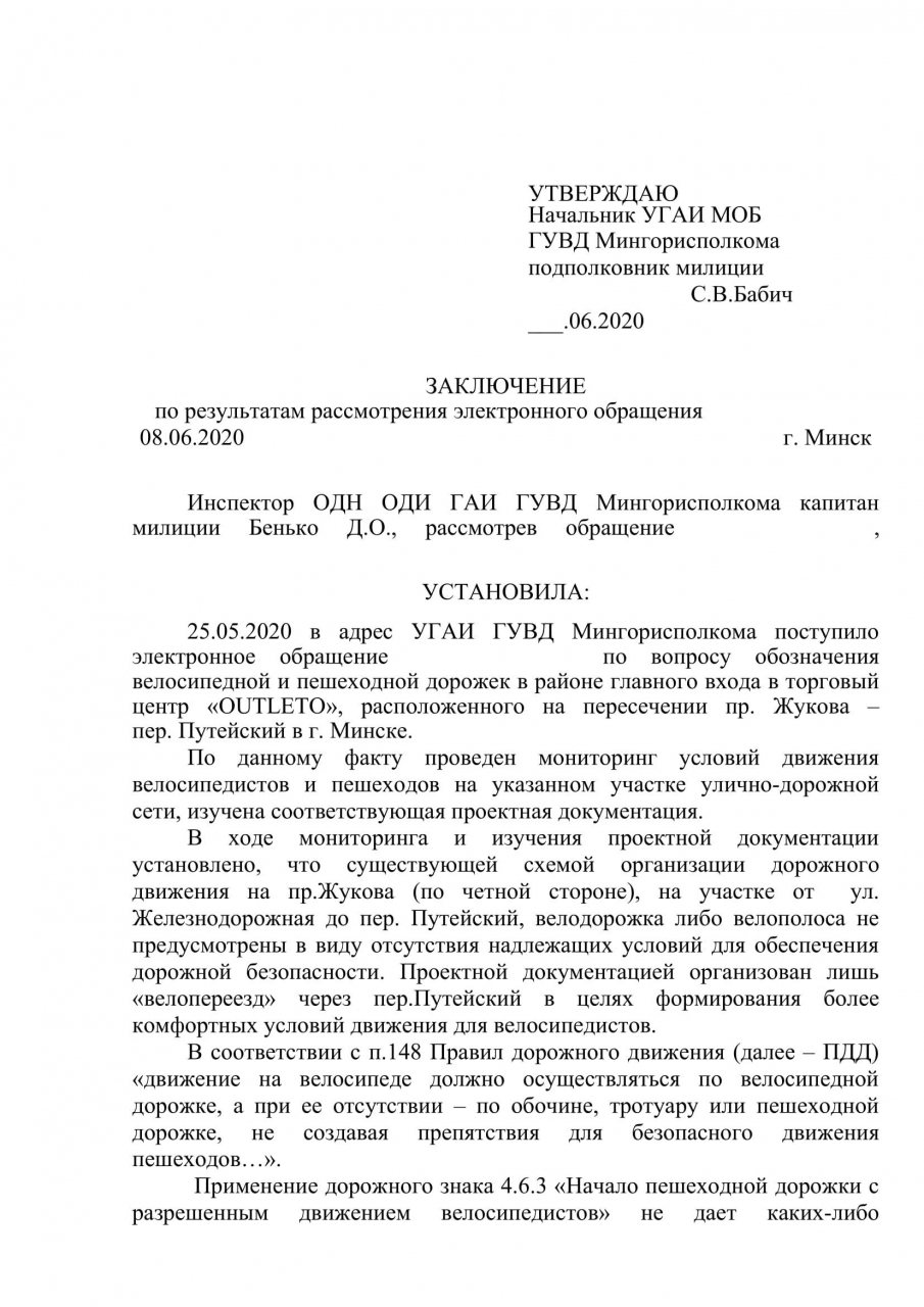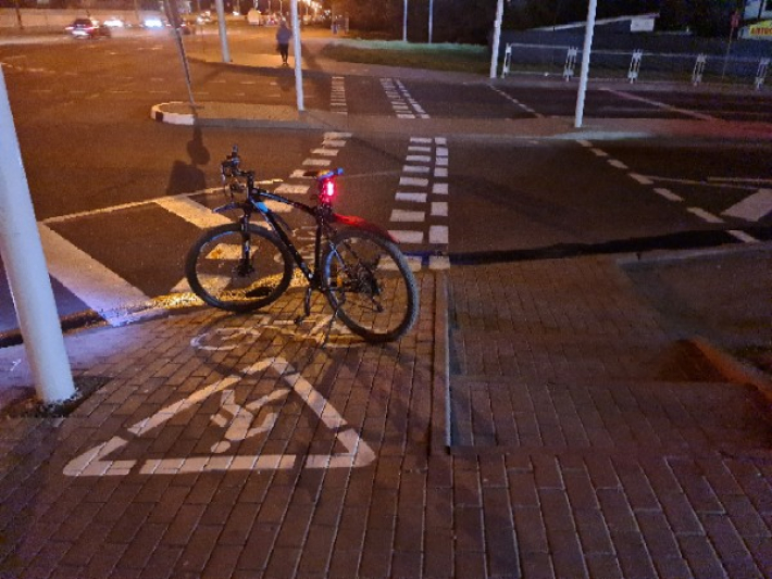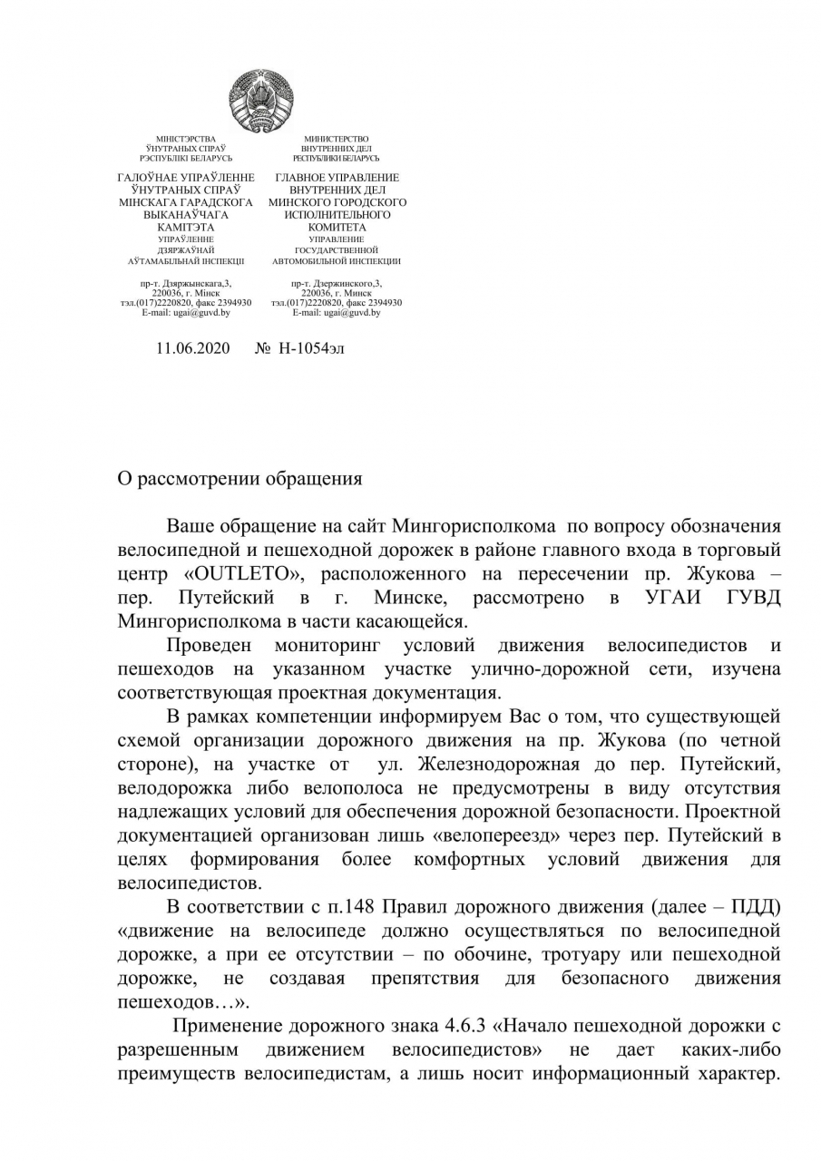 Просим обратить внимание и нанести дополнительную разметку "пешеход" и "велосипед" или же "совмещенная велодорожка" на расстоянии метра от края лестничных ступенек пешеходного перехода у торгового центра "Outleto" (пр-т Жукова, 44). Также просим конструктивно выделить эти зоны, а именно цветовое обозначение для пешеходов, идущих с данного торгового центра, либо в него.