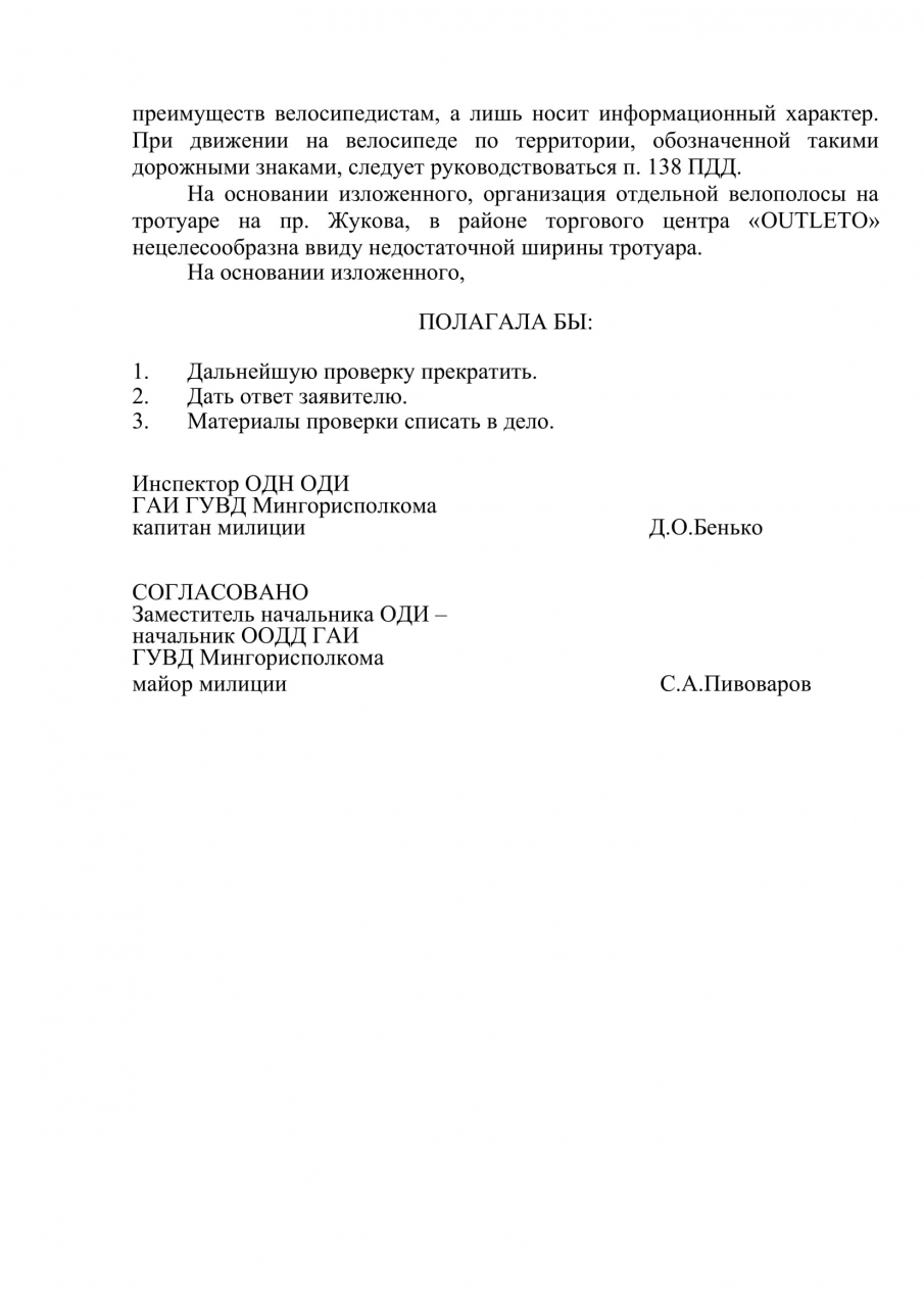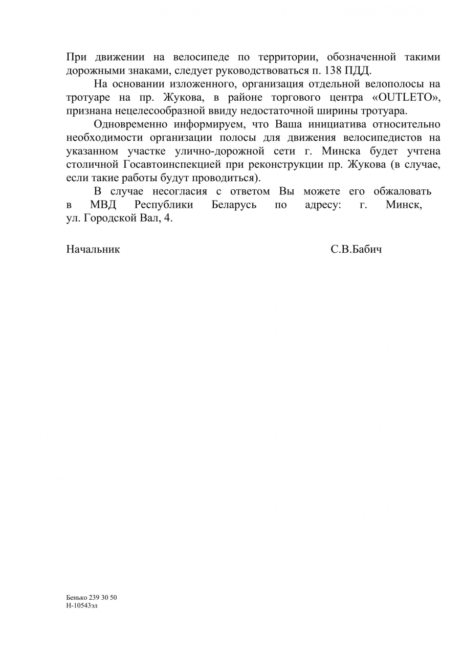 Организация отдельной велополосы на тротуаре на пр.Жукова, в районе торгового центра «OUTLETO», признана нецелесообразной ввиду недостаточной ширины тротуара.