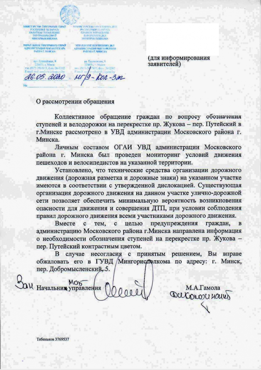 В администрацию Московского района г.Минска направлена информация о необходимости обозначения ступеней на перекрёстке пр-т Жукова - пер.Путейский контрастным цветом.