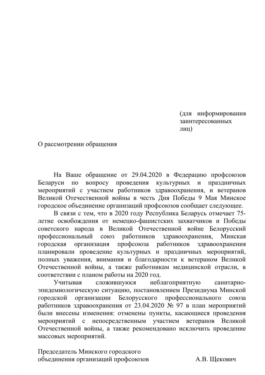 Недавно в Интернете появились сведения о том, что профсоюз работников здравоохранения якобы планирует проведение в честь Дня Победы 9 мая культурных и праздничных мероприятий с участием работников здравоохранения и ветеранов. Мы считаем чрезвычайно важным вклад ветеранов в победу над нацистской Германией и тоже хотели бы праздновать День Победы 9 мая, как обычно. Но мы не можем игнорировать тот факт, что в стране в настоящее время растёт заболеваемость опасной коронавирусной инфекцией COVID-19. Для замедления распространения инфекции Министерство здравоохранения Республики Беларусь и Всемирная организация здравоохранения рекомендуют, в числе прочего, ограничить социальные контакты и избегать посещения пожилых людей, так как для последних особо высок риск тяжёлого течения инфекции.