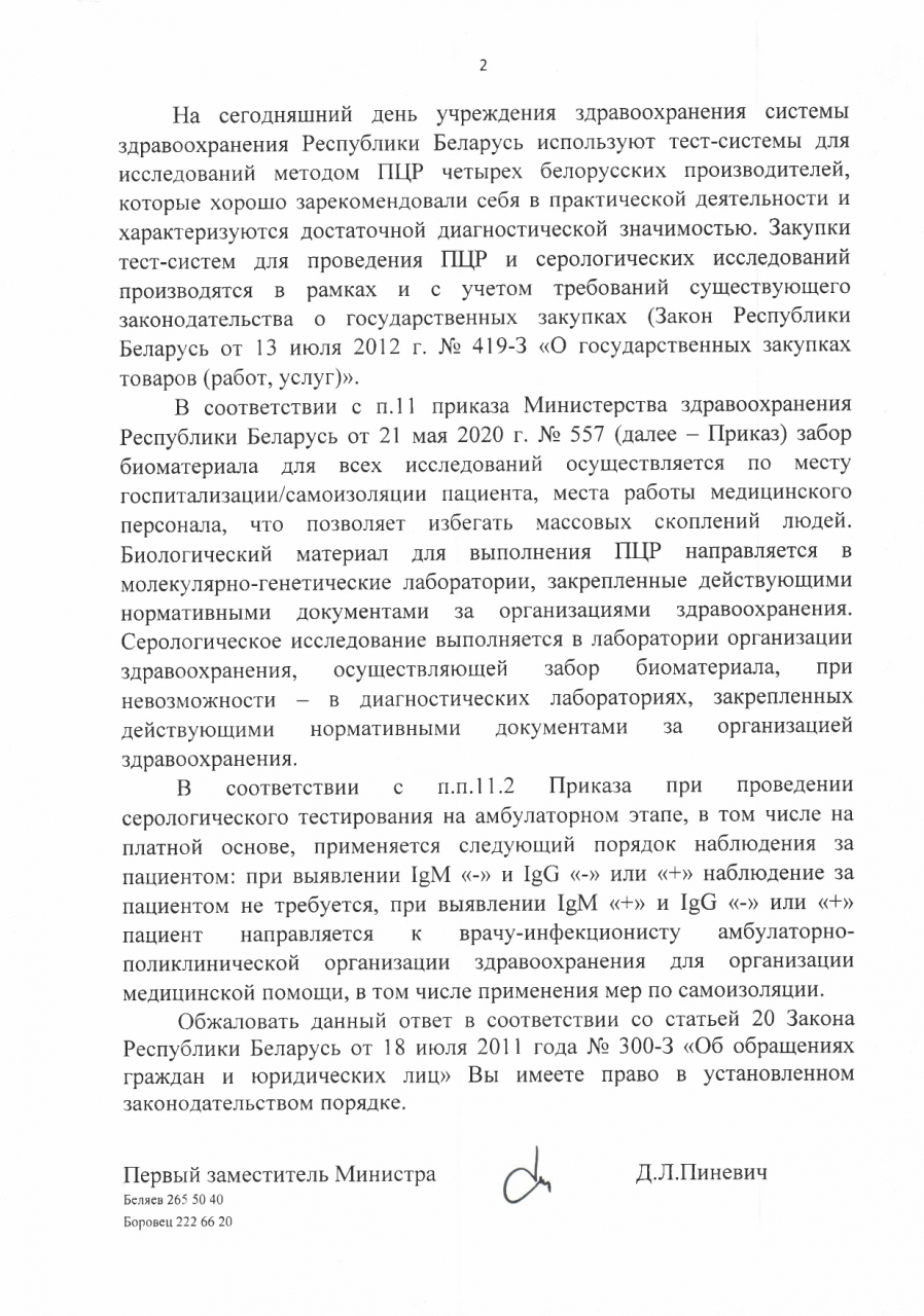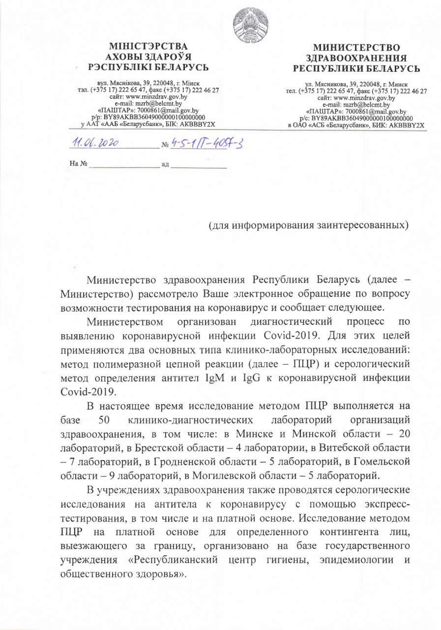 Еще 17 апреля Министр здравоохранения Республики Беларусь В. Караник заявил, что в ближайшее время на платной основе можно будет сдавать тесты на определение антител к COVID-19. 22 апреля это подтвердила заместитель начальника отдела гигиены, эпидемиологии и профилактики Минздрава И. Карабан, которая отметила, что тесты должны поступить в страну к концу апреля, после чего наступит этап их проверки. Затем должно было последовать решение о тестировании всех желающих.