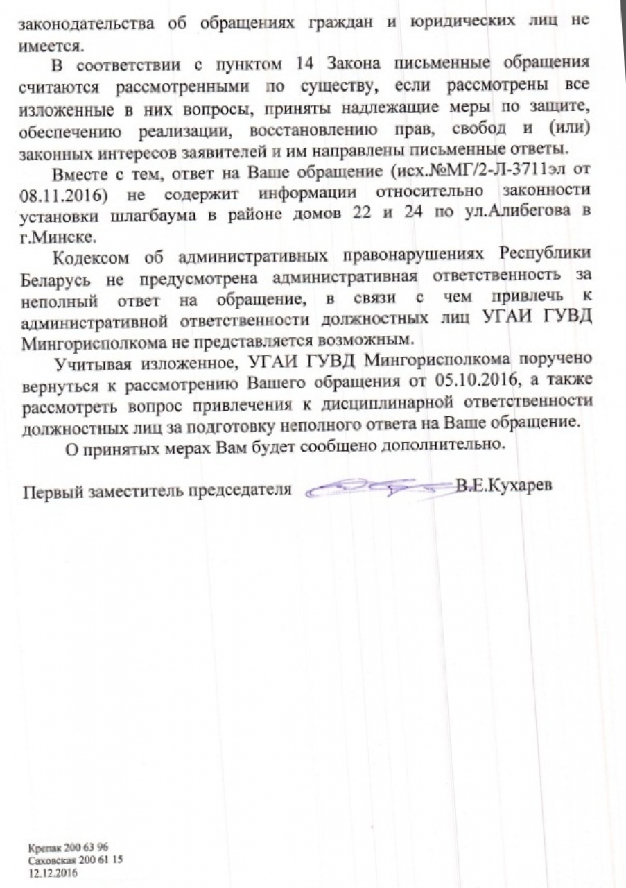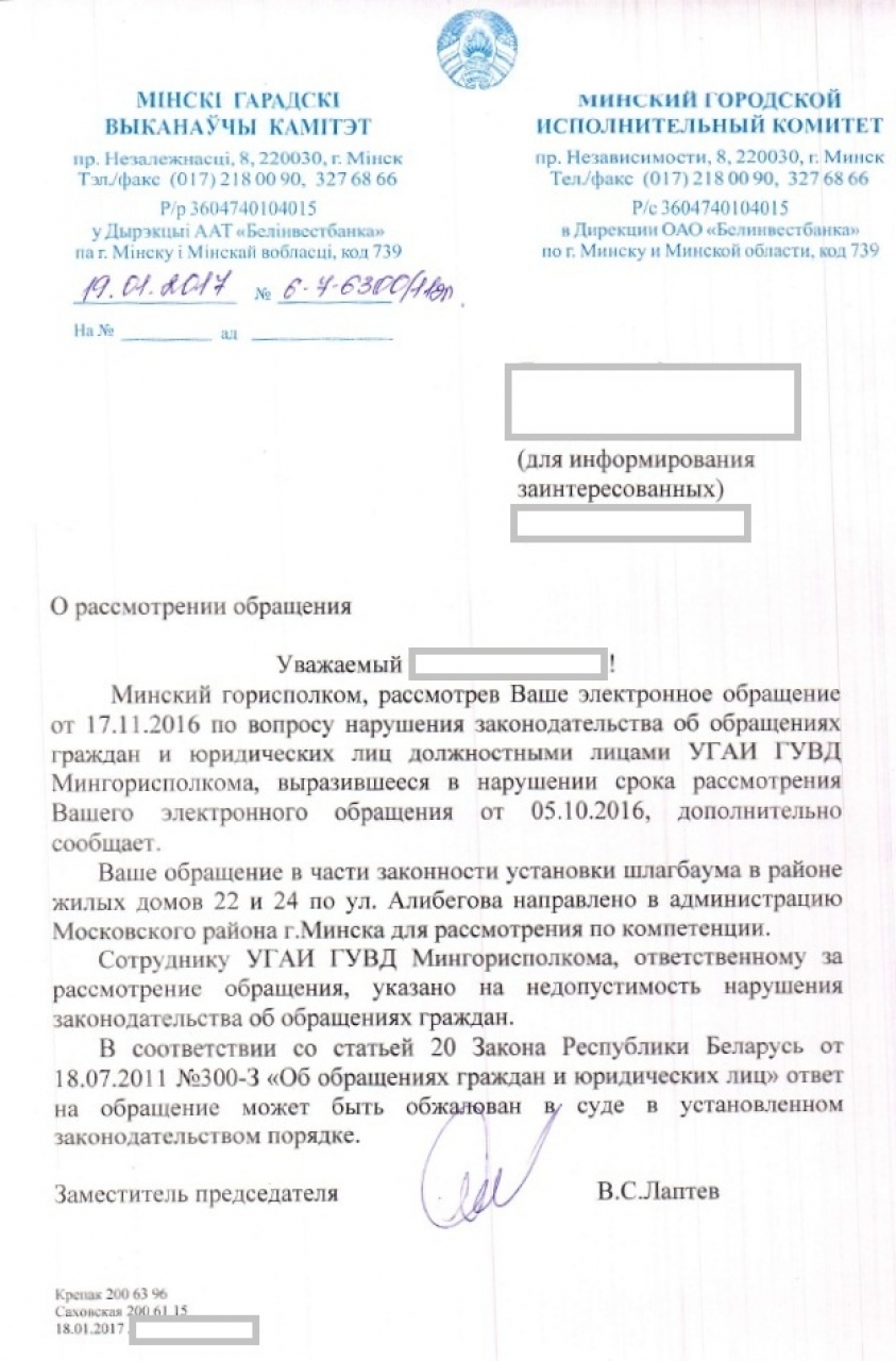 2. Просим провести проверку законности установки шлагбаума, ограничивающего проезд к местам общей парковки автомобилей в районе домов 22 и 24 по ул.Алибегова в г. Минске.".