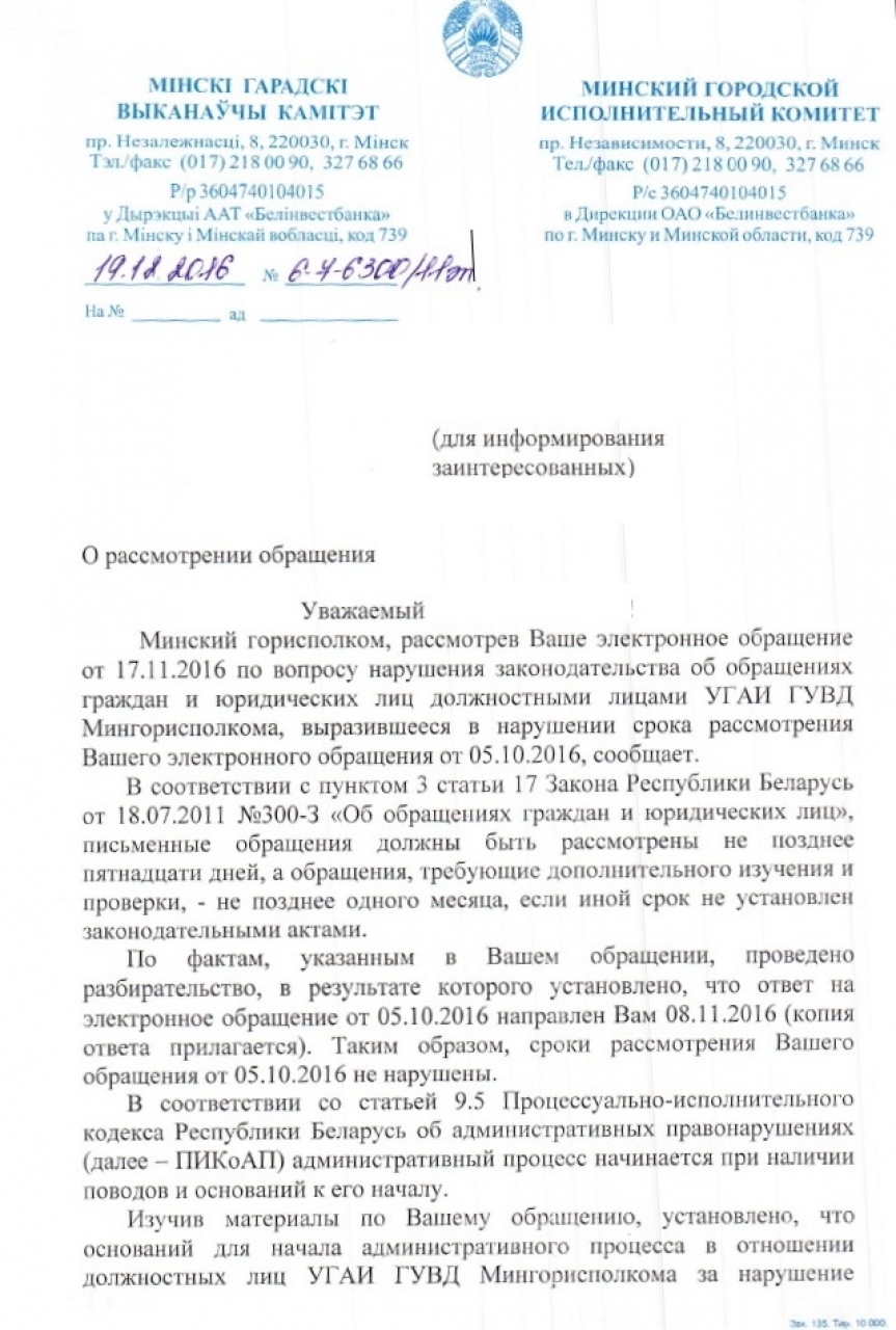 Согласно ст. 17 Закона Республики Беларусь письменные обращения должны быть рассмотрены не позднее пятнадцати дней, а обращения, требующие дополнительного изучения и проверки, – не позднее одного месяца. Таким образом, усматривается нарушение сроков рассмотрения обращения со стороны Управления государственной автоинспекции ГУВД Мингорисполкома.