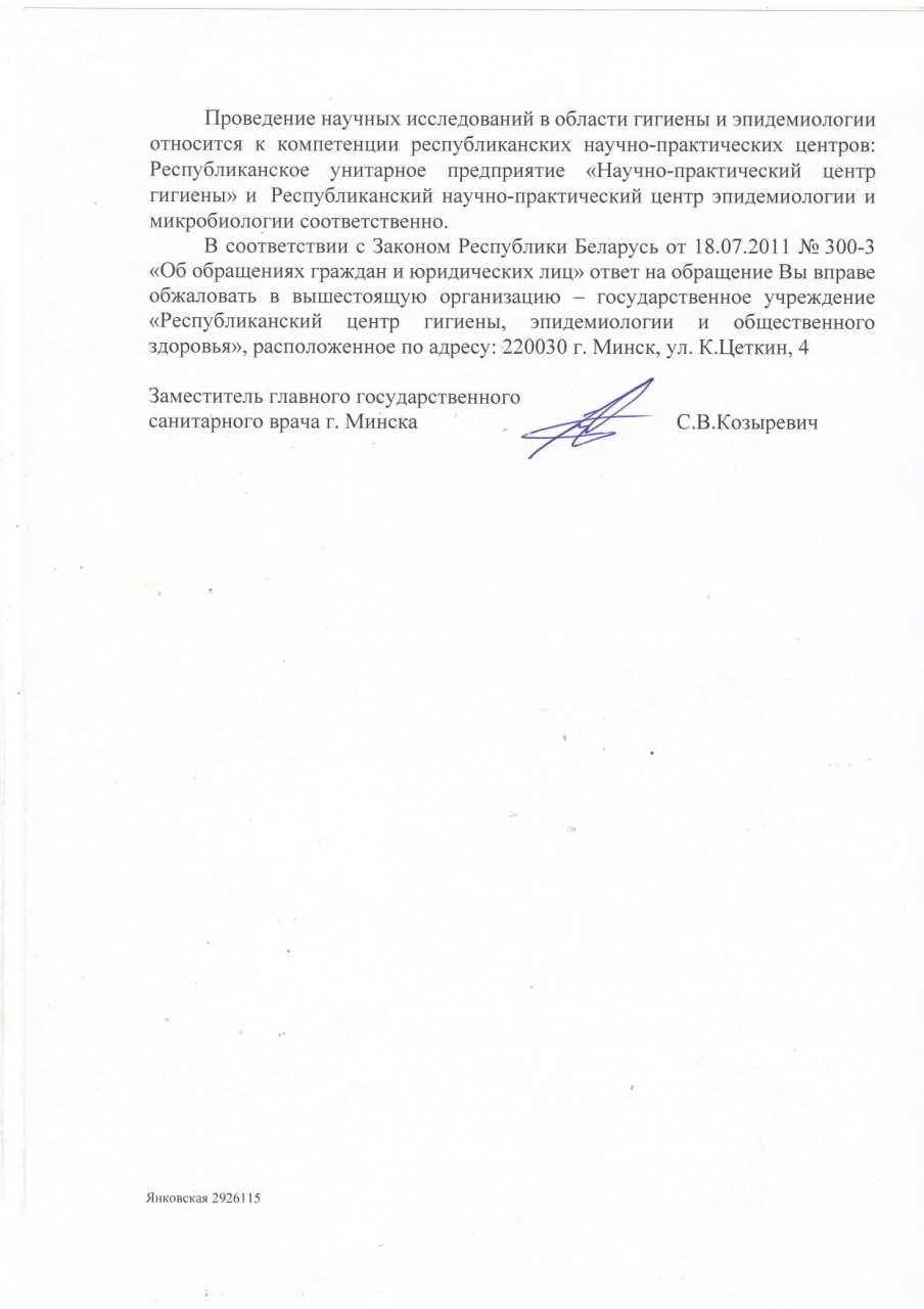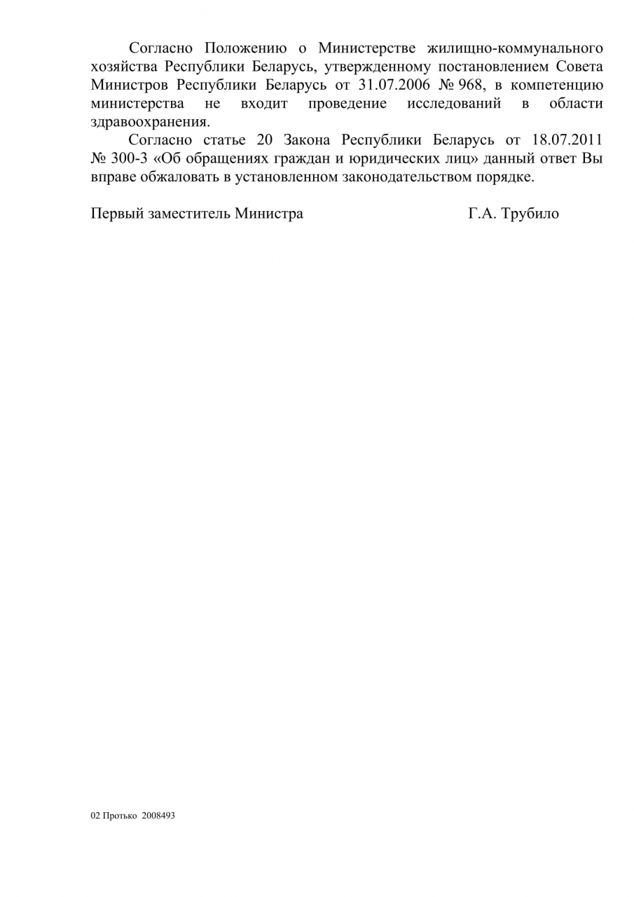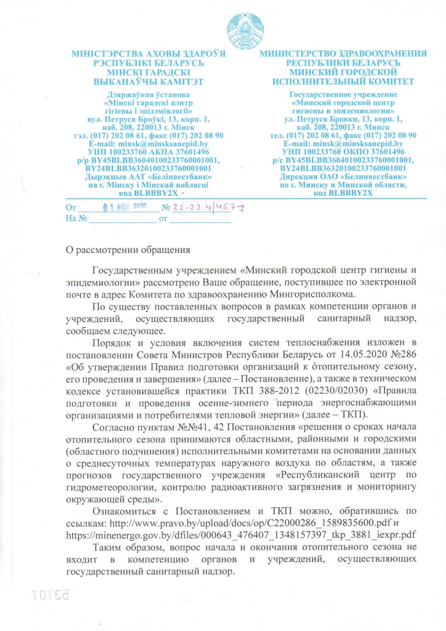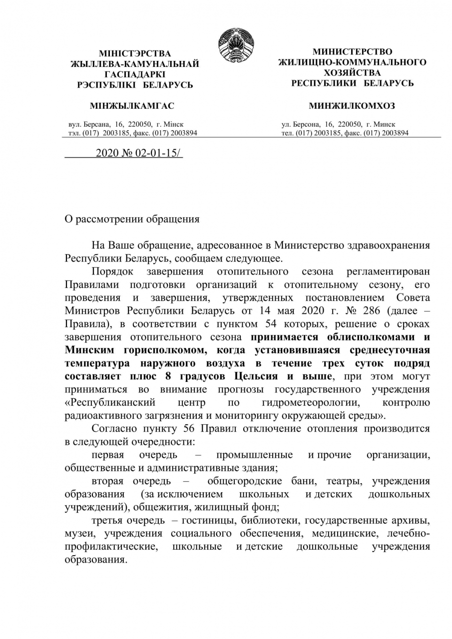 2. инициировать разработку законодательного акта, который будет требовать от ЖКХ соблюдения рекомендаций Министерства здравоохранения Республики Беларусь в вопросах дат отопительного сезона.