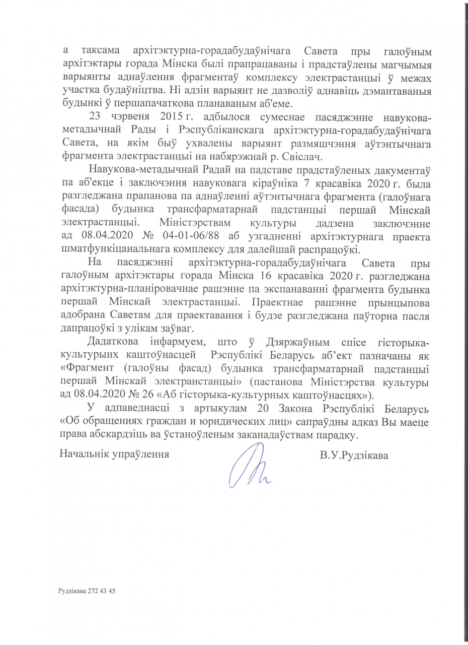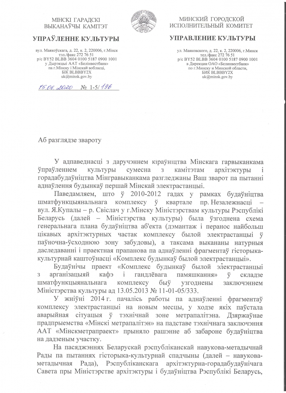 У сувязі з гэтым патрабуем вярнуць аднаўленне фрагментаў будынкаў былой электрастанцыі ў рэчышча беларускага заканадаўства і міжнародных пагадненняў па ахове гісторыка-культурных каштоўнасцей. Адзіным дапушчальным варыянтам у дадзеным выпадку застанецца прапанова 2012 года з арыентацыяй фасадаў на праспект Незалежнасці.