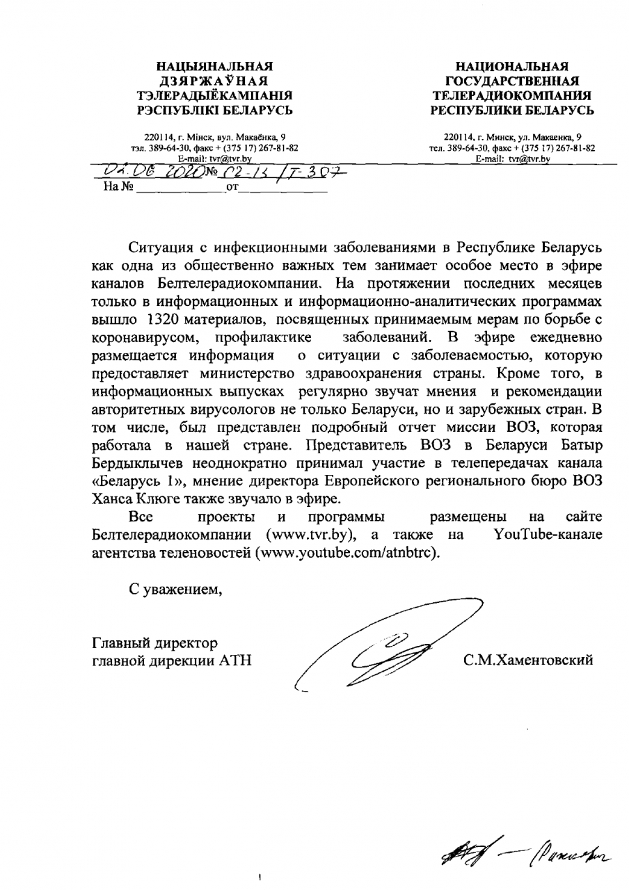 - опубликовать все рекомендации миссии ВОЗ по физическому дистанцированию и другие рекомендации, а также указанные выше цитаты (либо полные тексты выступлений) представителей ВОЗ в эфире всех своих телеканалов и радиостанций (для Белтелерадиокомпании), на своих страницах (для “Беларусь Сегодня”);