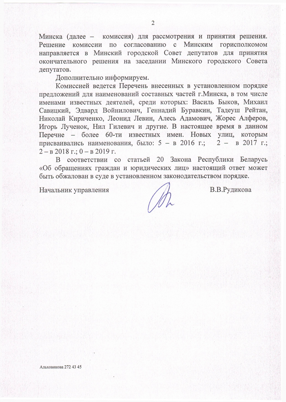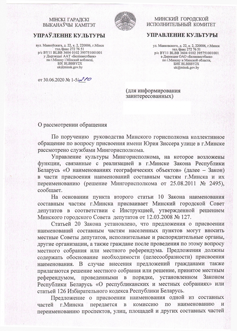 Мы, нижеподписавшиеся, обращаемся в Минский городской исполнительный комитет с просьбой о присвоении одной из городских улиц Минска имени Юрия Зиссера как увековечение памяти человека, которым страна может и должна гордиться, человека, чей вклад в развитие современной Беларуси невозможно оценить и переосмыслить.
