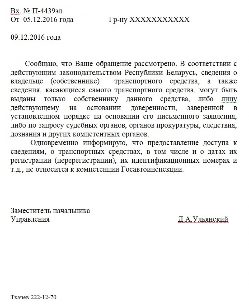 В соответствии с законодательством, сведения, касающиеся транспортного средства, могут быть выданы только собственнику либо лицу, действующему на основании доверенности, либо по запросу судебных органов, органов прокуратуры, следствия, дознания и других компетентных органов.