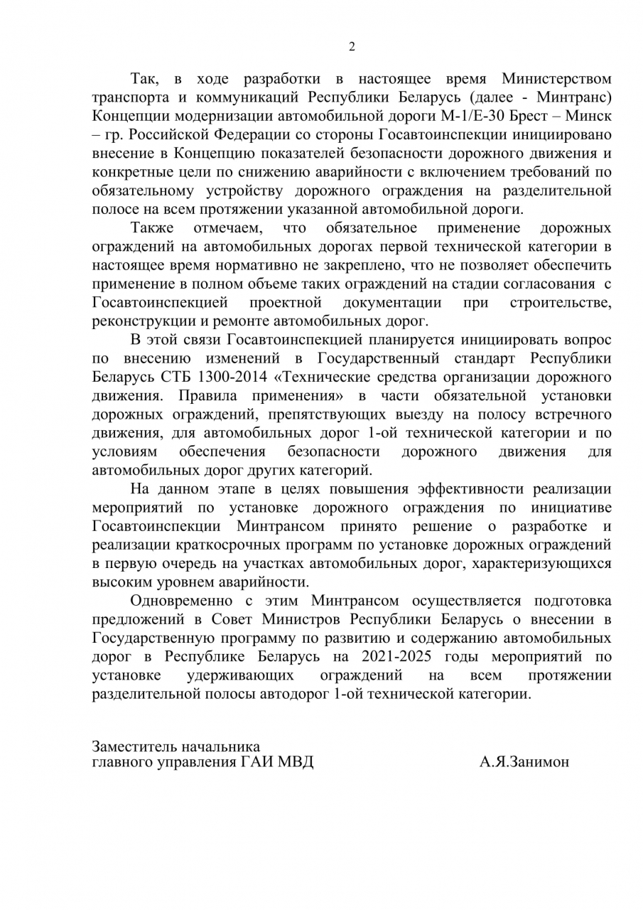 В ходе разработки в настоящее время Минтрансом Концепции модернизации автомобильной дороги М-1/Е-30 Брест – Минск – гр. Российской Федерации со стороны Госавтоинспекции инициировано внесение в Концепцию показателей безопасности дорожного движения и конкретные цели по снижению аварийности с включением требований по обязательному устройству дорожного ограждения на разделительной полосе на всем протяжении указанной автомобильной дороги. Госавтоинспекцией планируется инициировать вопрос по внесению изменений в Государственный стандарт Республики Беларусь СТБ 1300-2014 «Технические средства организации дорожного движения. Правила применения» в части обязательной установки дорожных ограждений, препятствующих выезду на полосу встречного движения, для автомобильных дорог 1-ой технической категории и по условиям обеспечения безопасности дорожного движения для автомобильных дорог других категорий.
