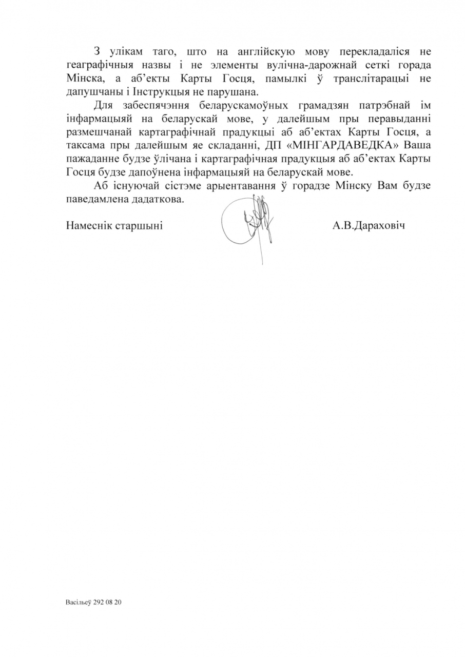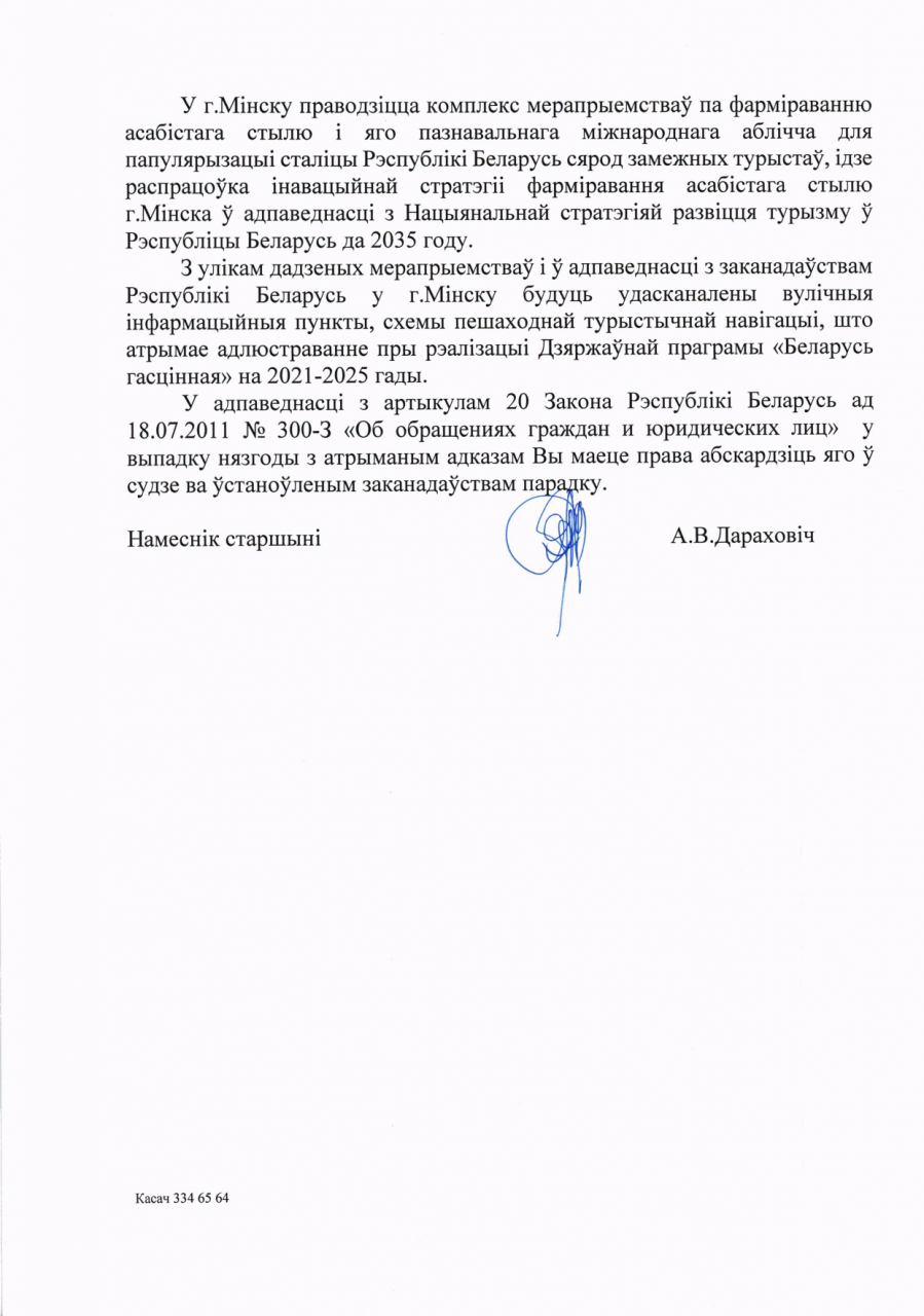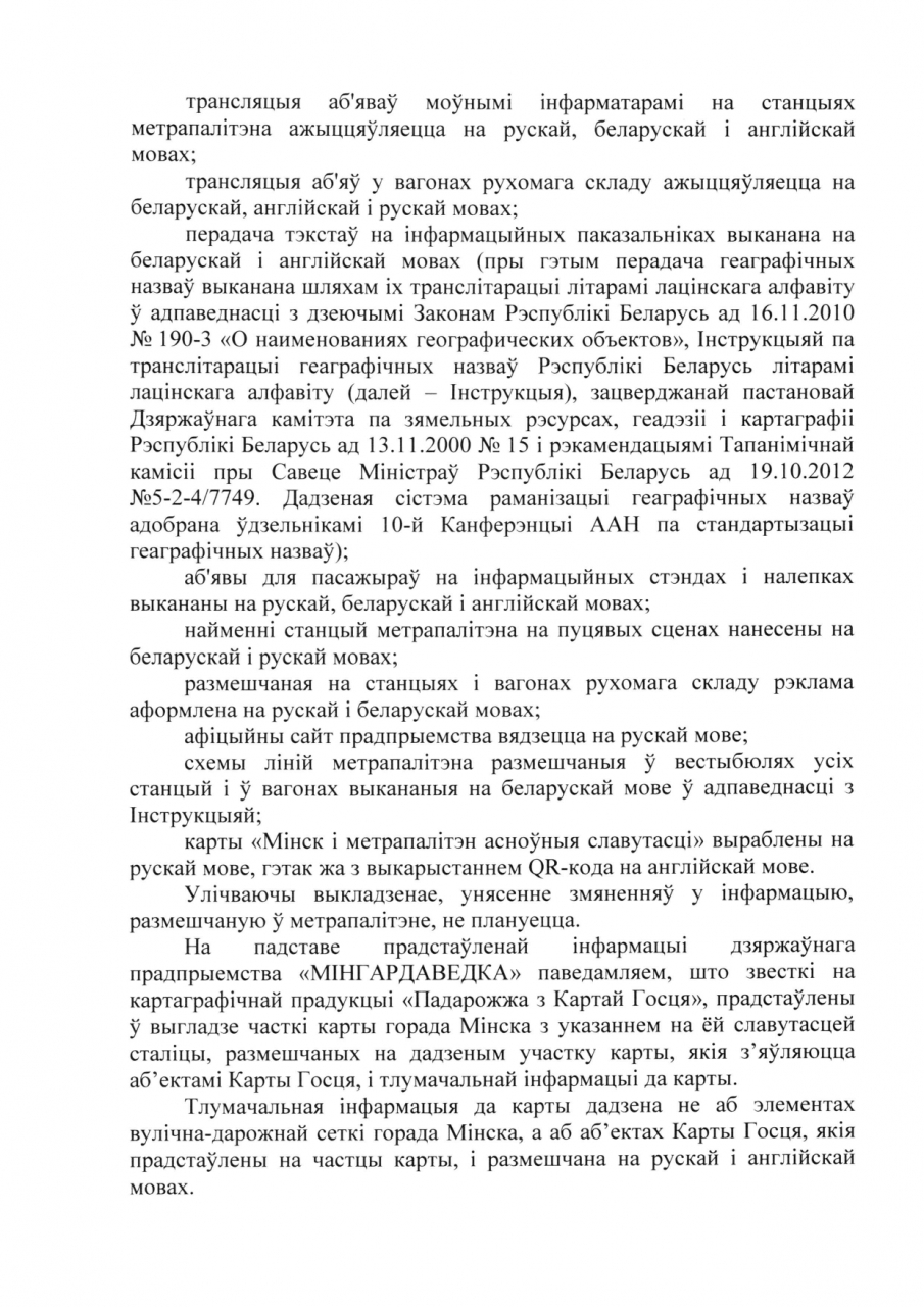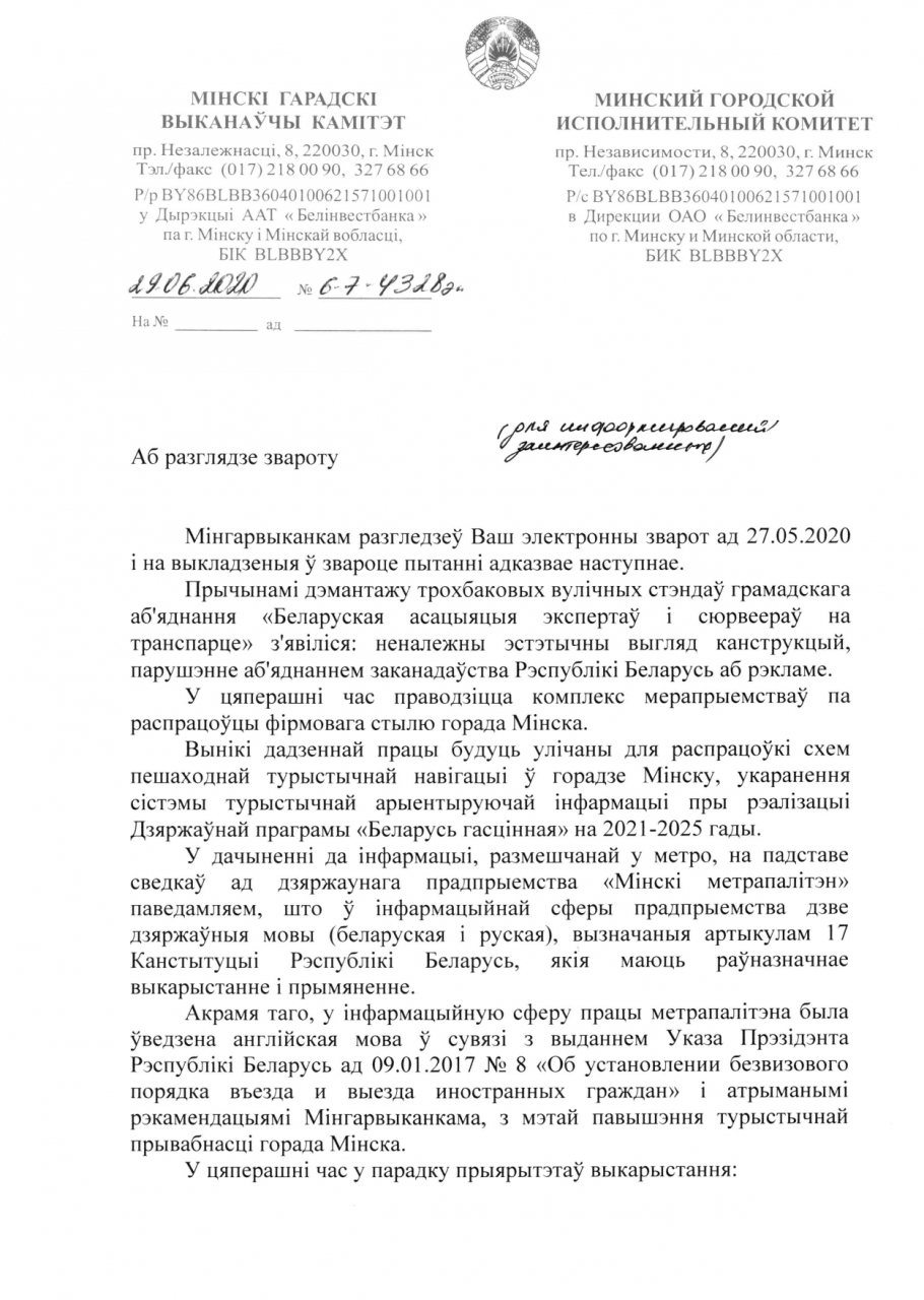 У цяперашні час праводзіцца комплекс мерапрыемстваў па распрацоўцы фірмовага стылю горада Мінску, вынікі дадзенай працы будуць улічаны для распрацоўкі схем пешаходнай турыстычнай навігацыі ў Мінску, укаранення сістэмы турыстычнай арыентуючай інфармацыі пры рэалізацыі Дзяржпраграмы "Беларусь гасціная" на 2021-2025 гг. Унясненне змяненняў у інфармацыю, размешчаную ў метрапалітэне, не плануецца.